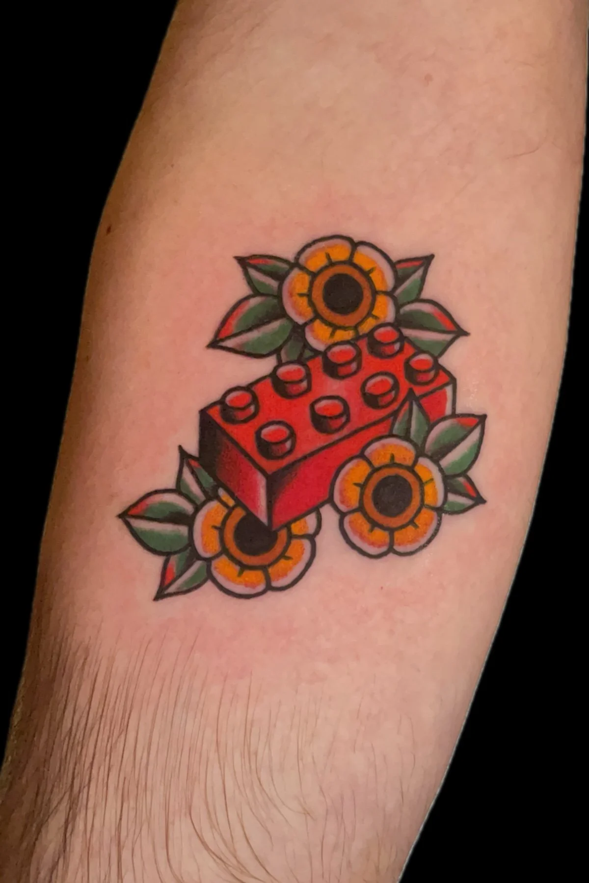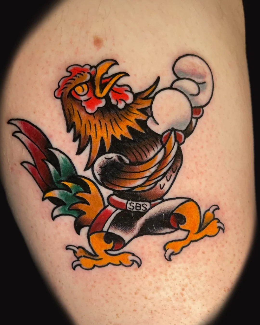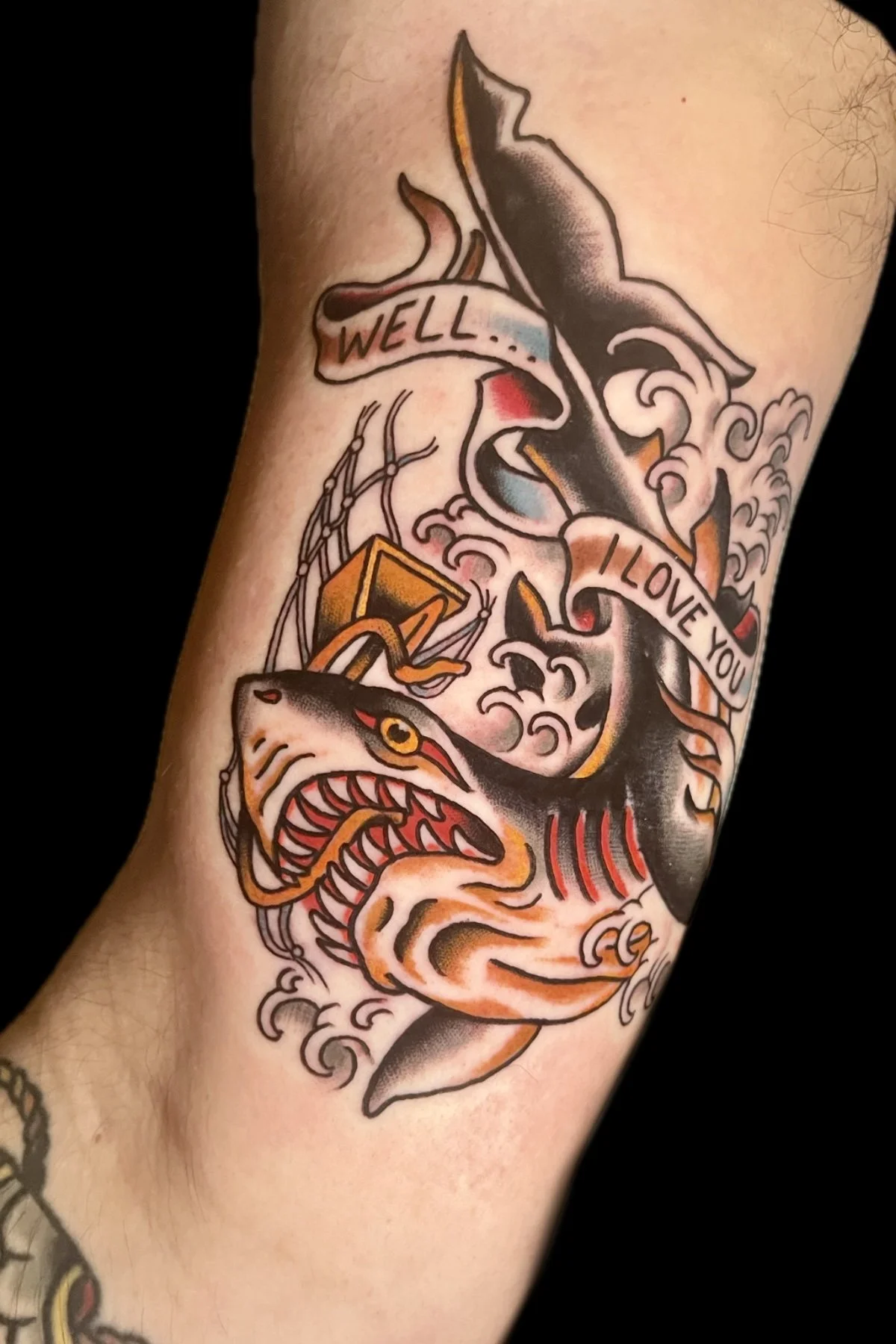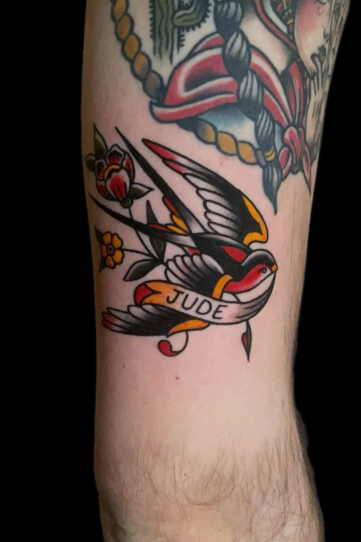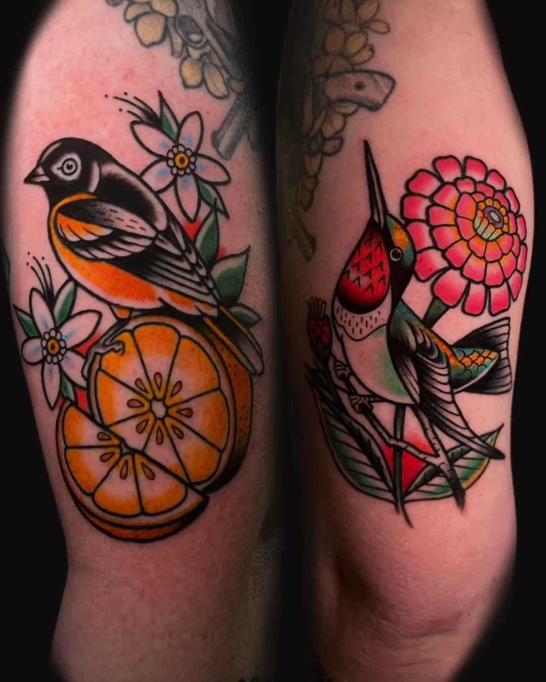 Tattoos of colorful birds, flowers, and orange slices on two arms