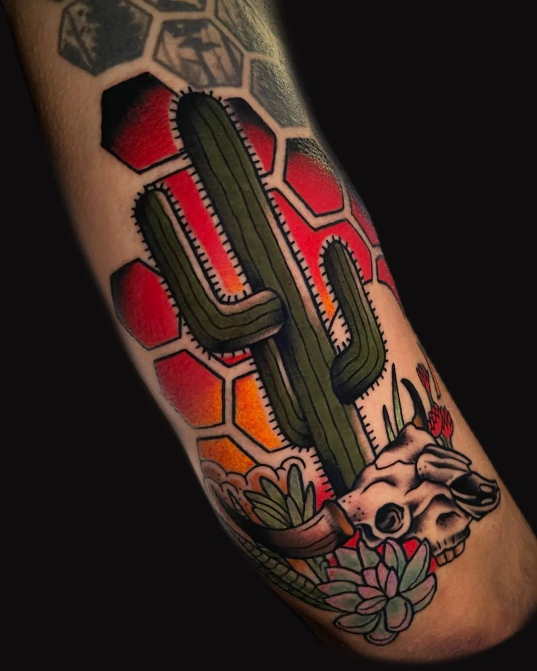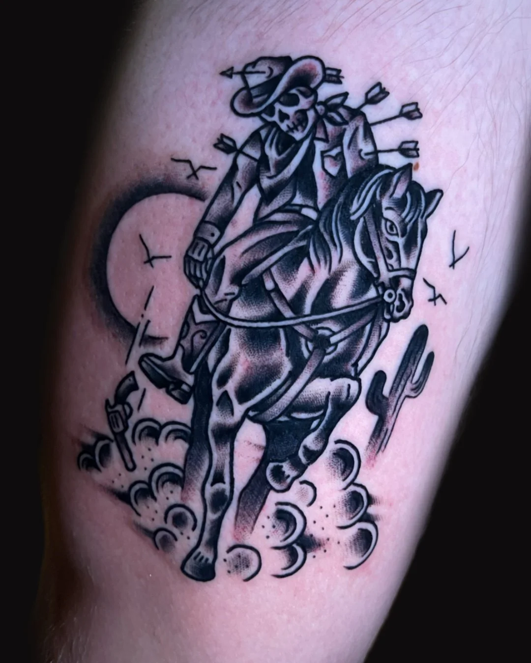 Tattoo of a skeleton cowboy riding a horse, carrying arrows, with cacti and clouds in the background.