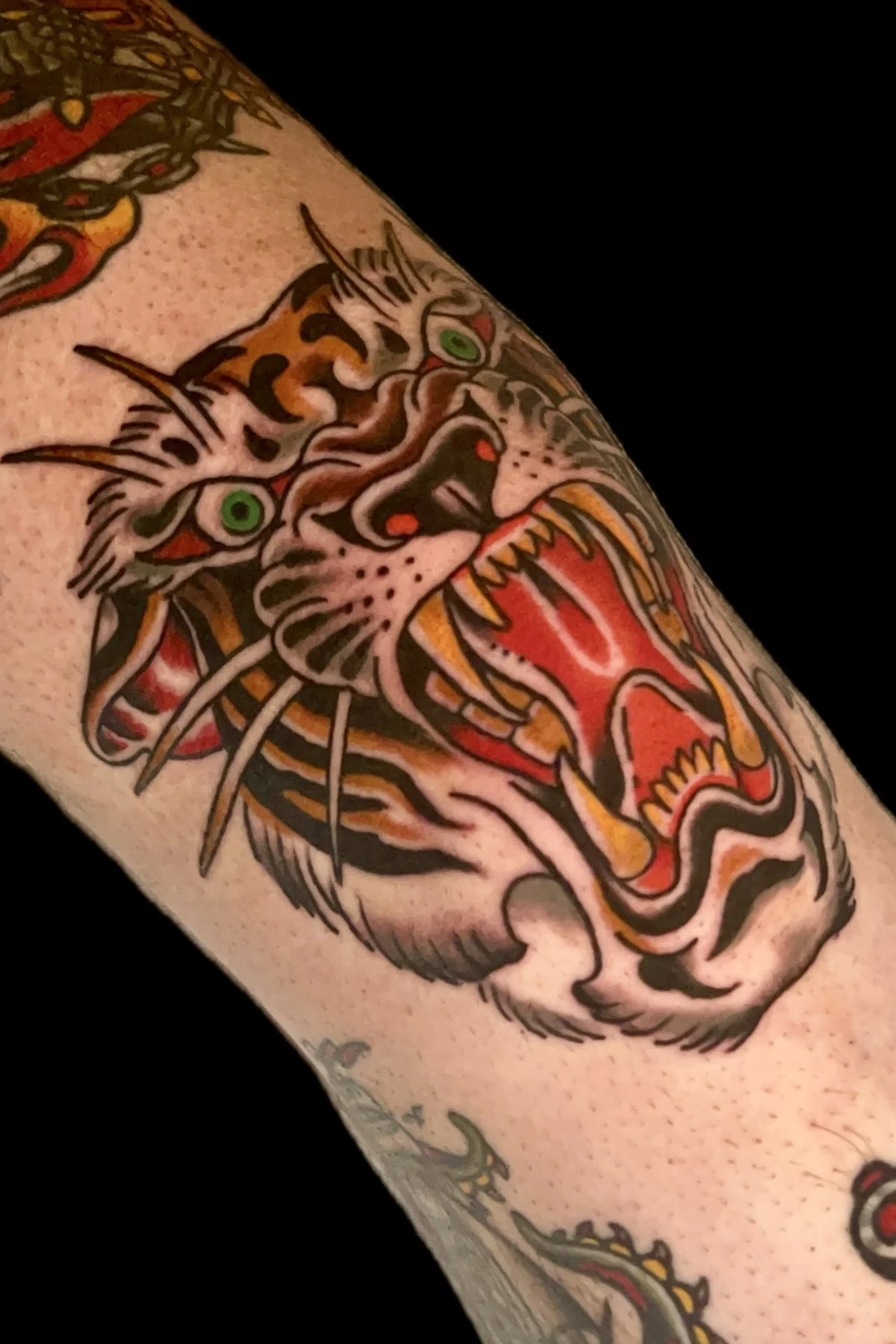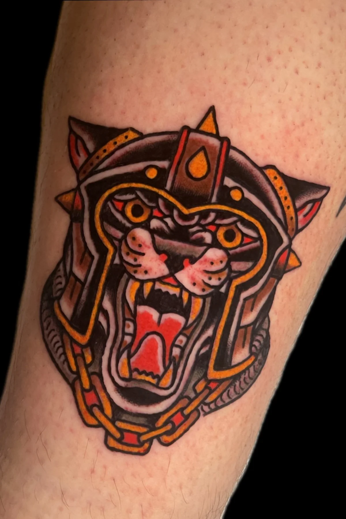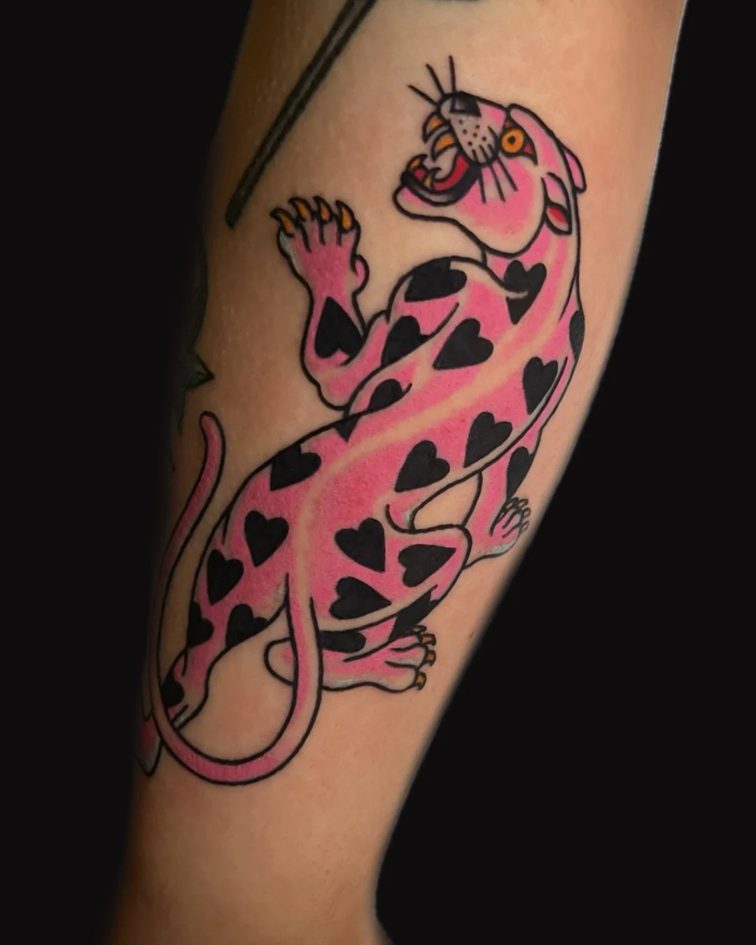 Tattoo of a pink leopard with black heart spots, yellow claws, and an open mouth showing sharp teeth.