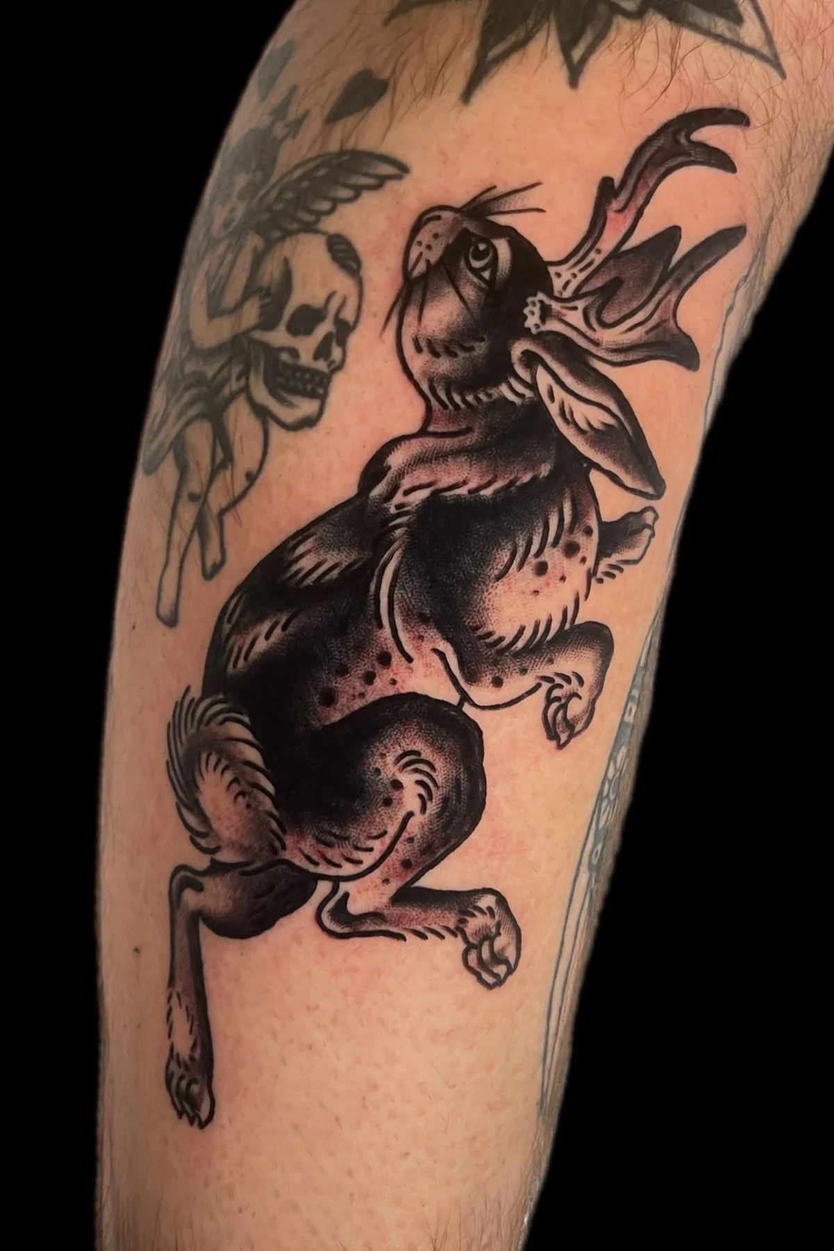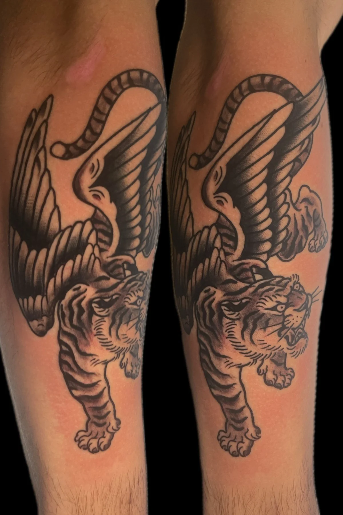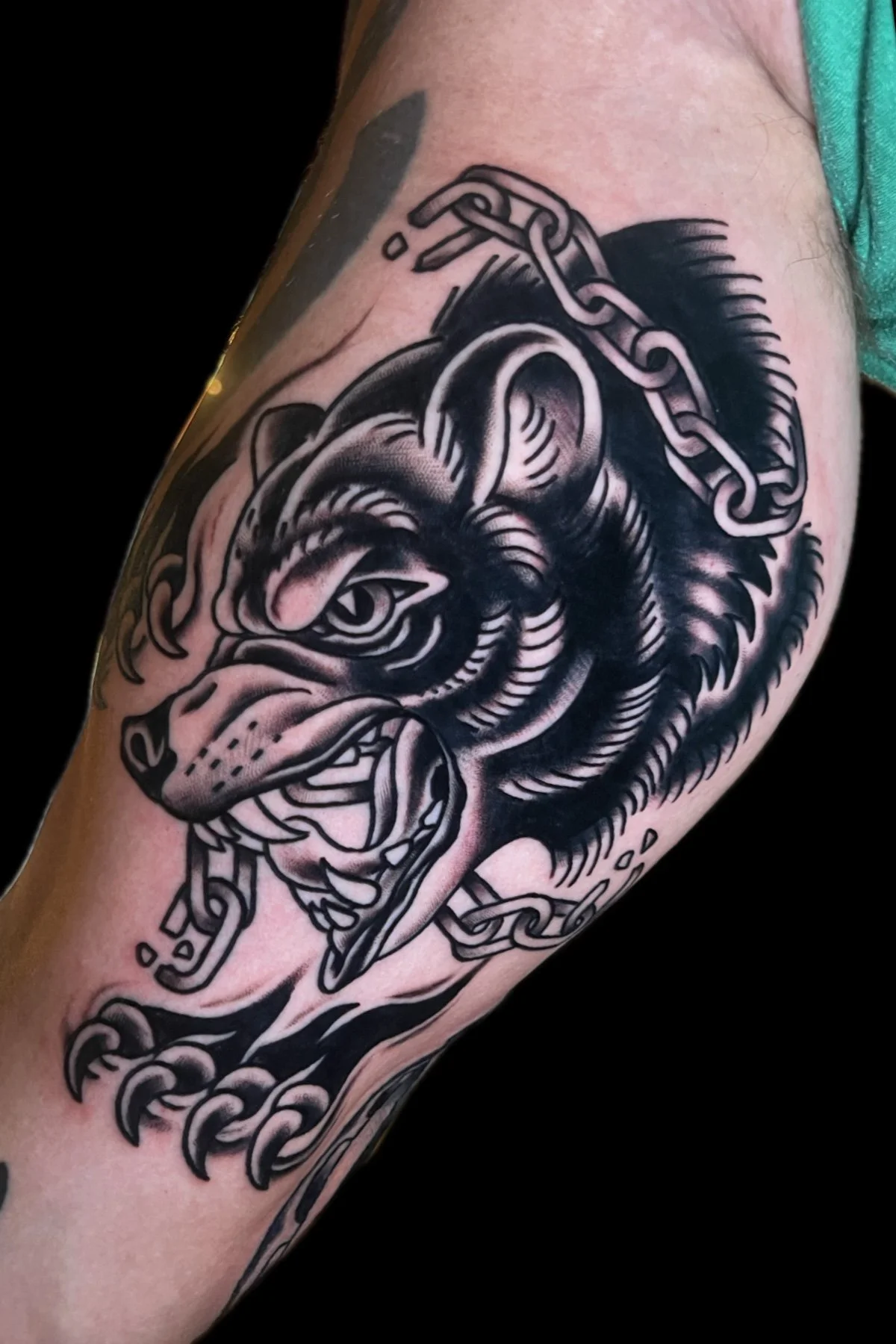 Tattoo of a pink leopard with black heart spots, yellow claws, and an open mouth showing sharp teeth.