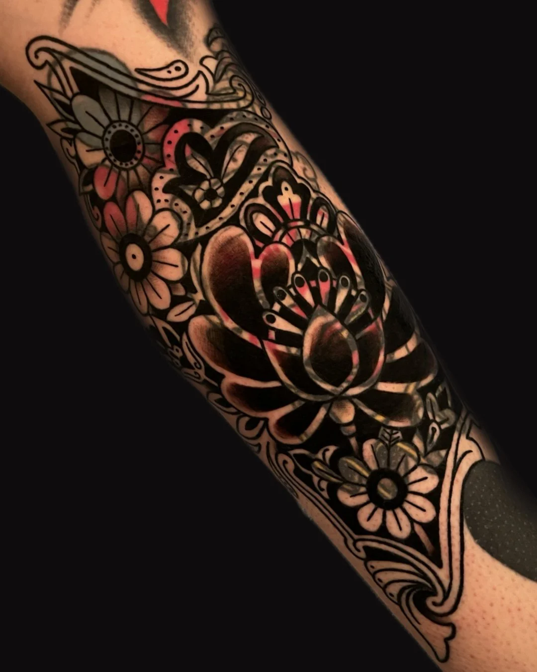 Black and gray floral tattoo on a person's arm, featuring a large lotus flower with mandala-like details, surrounded by smaller flowers and decorative patterns.