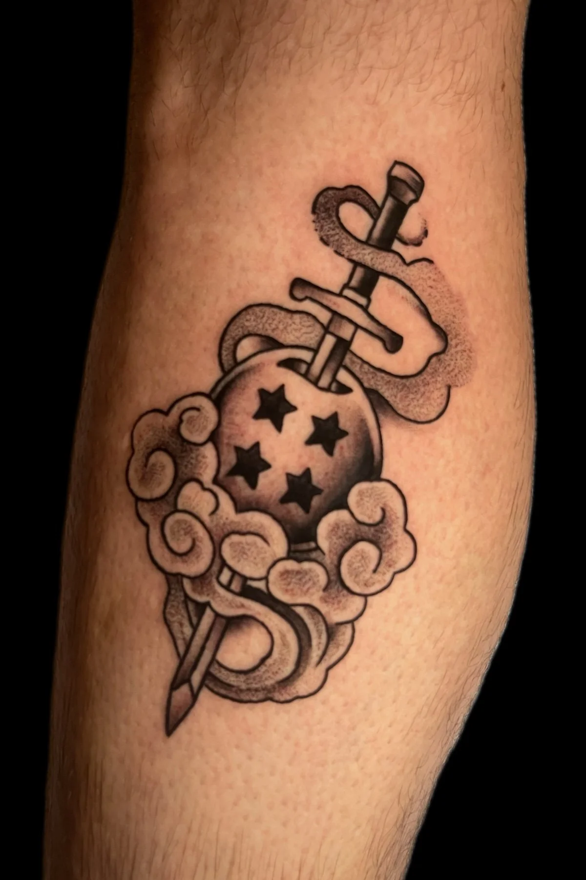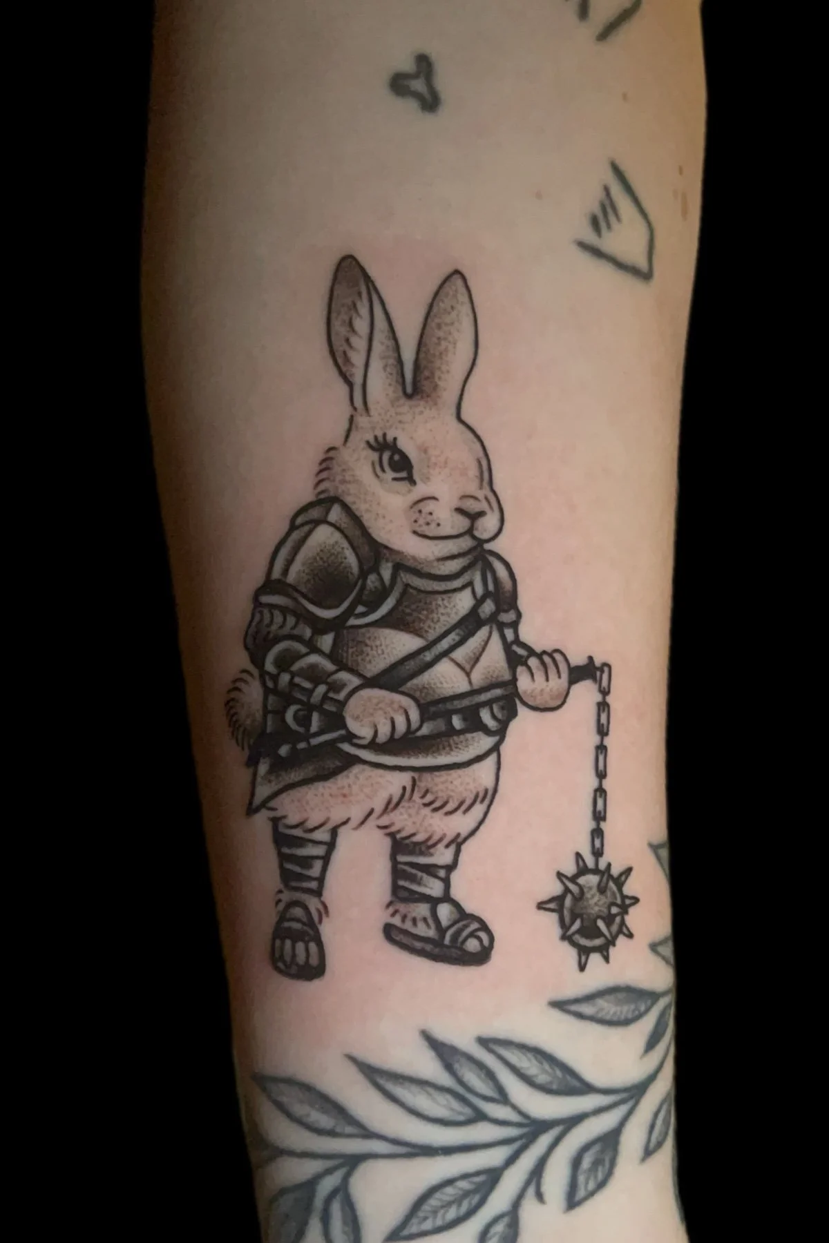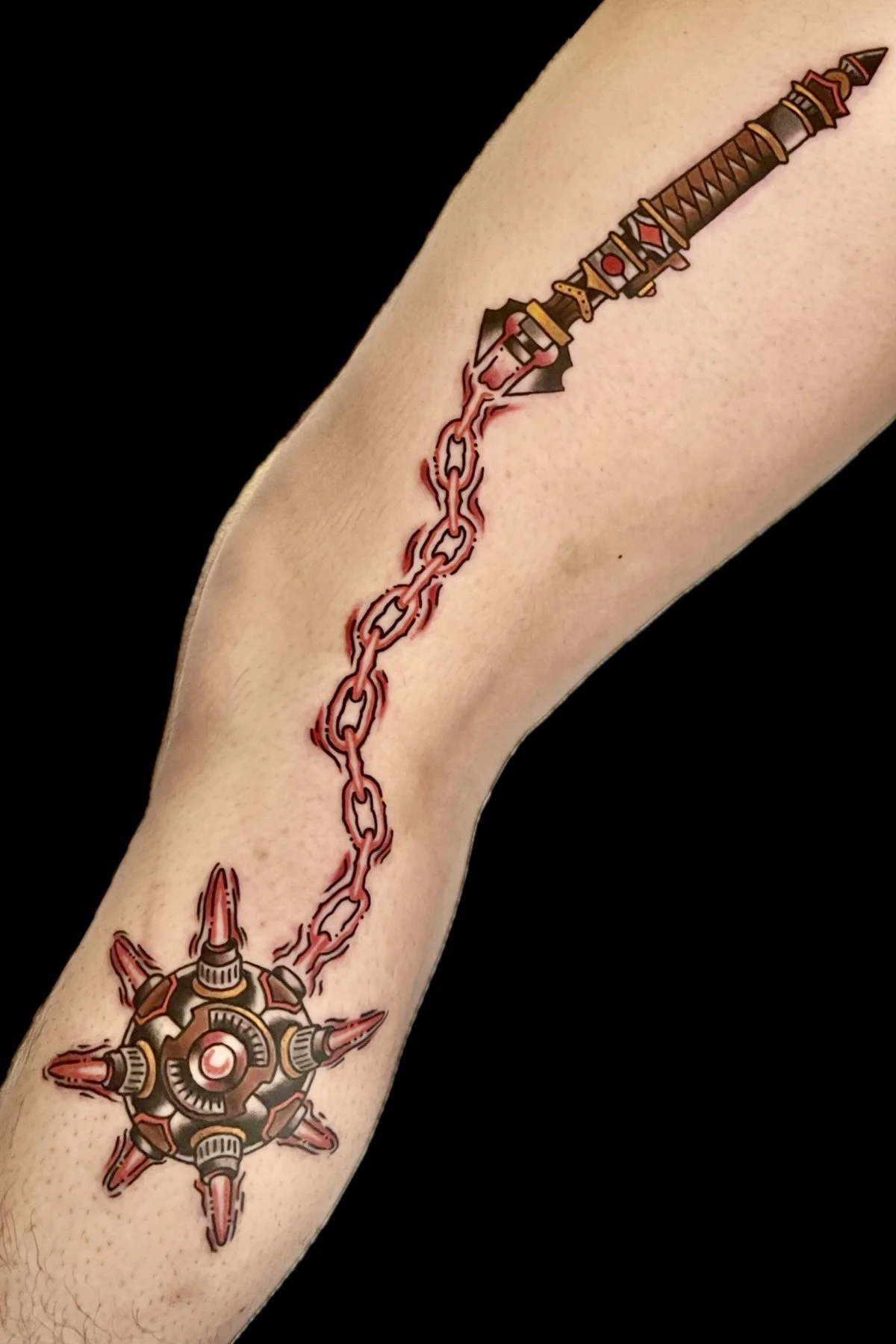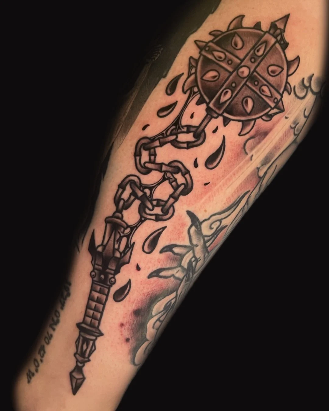 Black and gray tattoo of a spiked mace with a chain attached to a dagger on a person's arm.