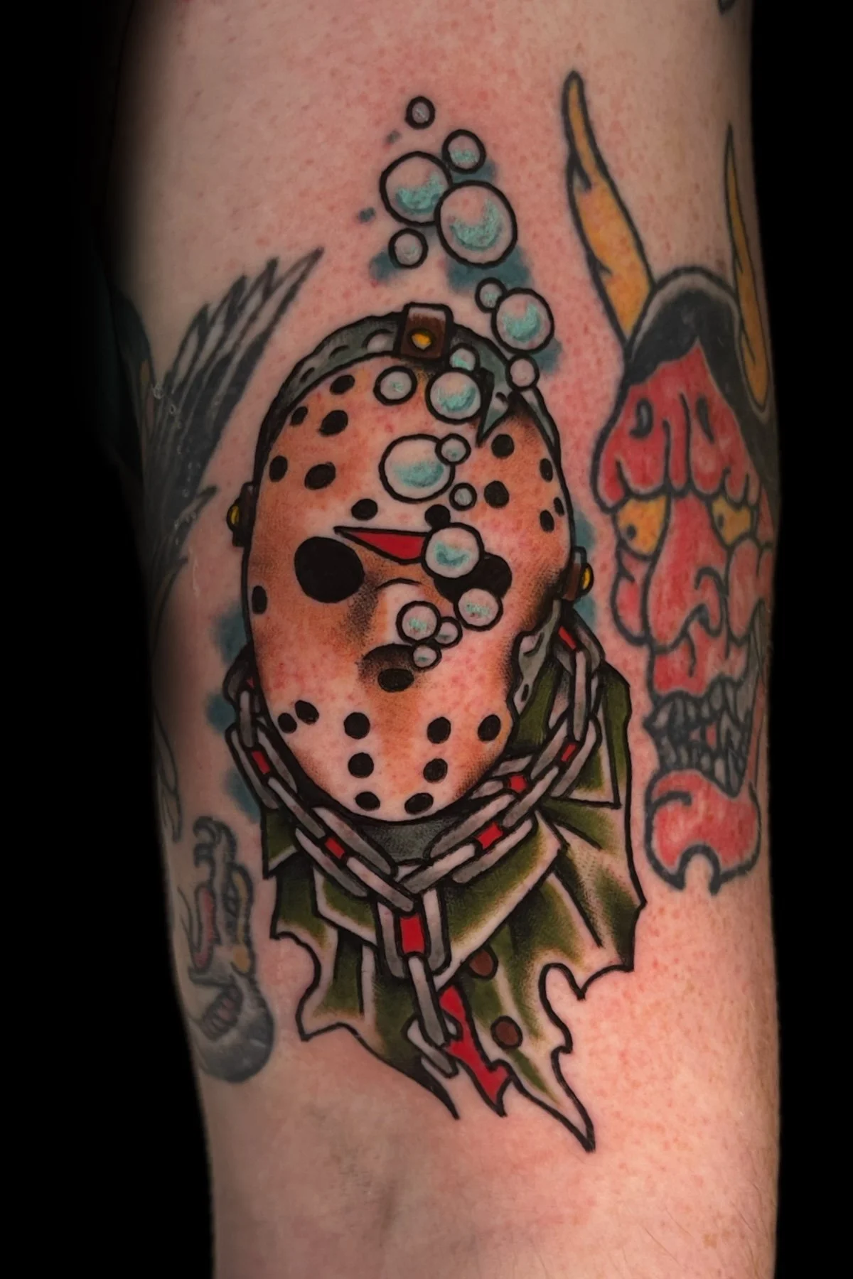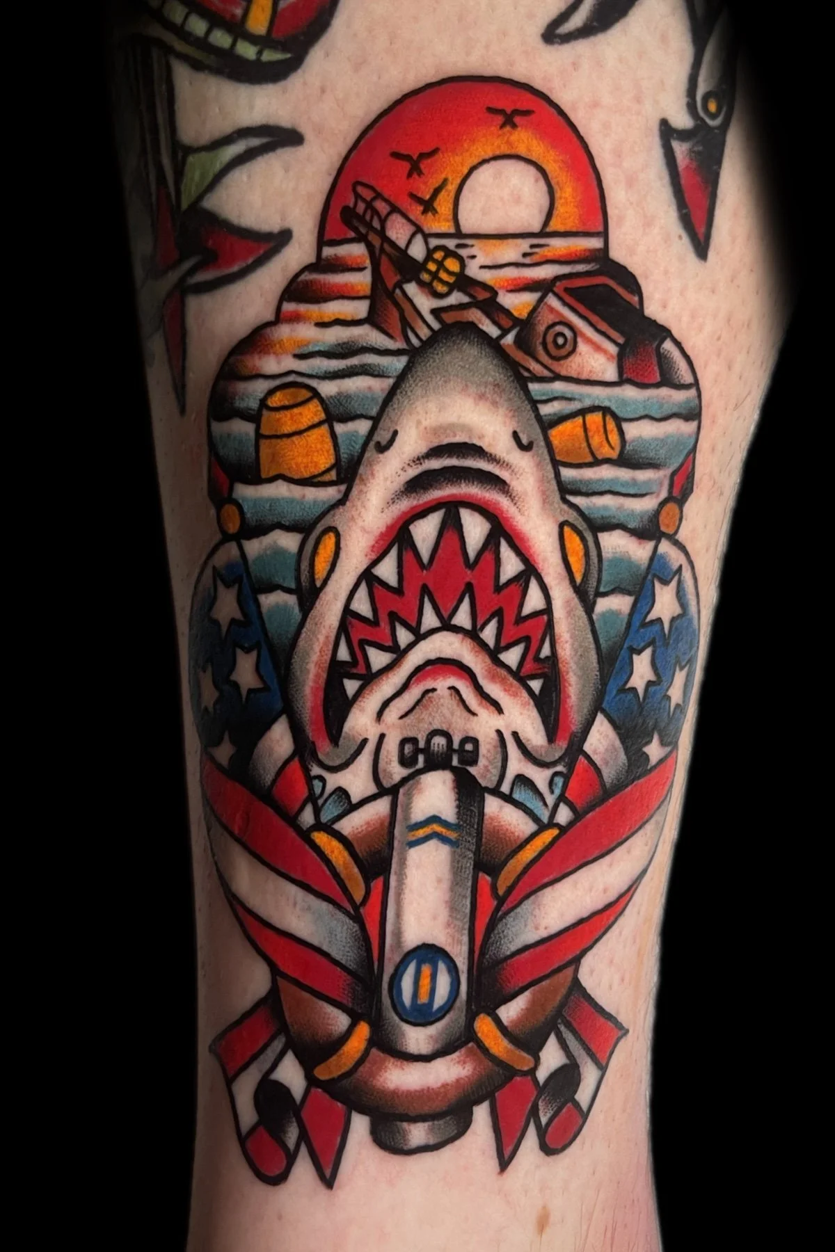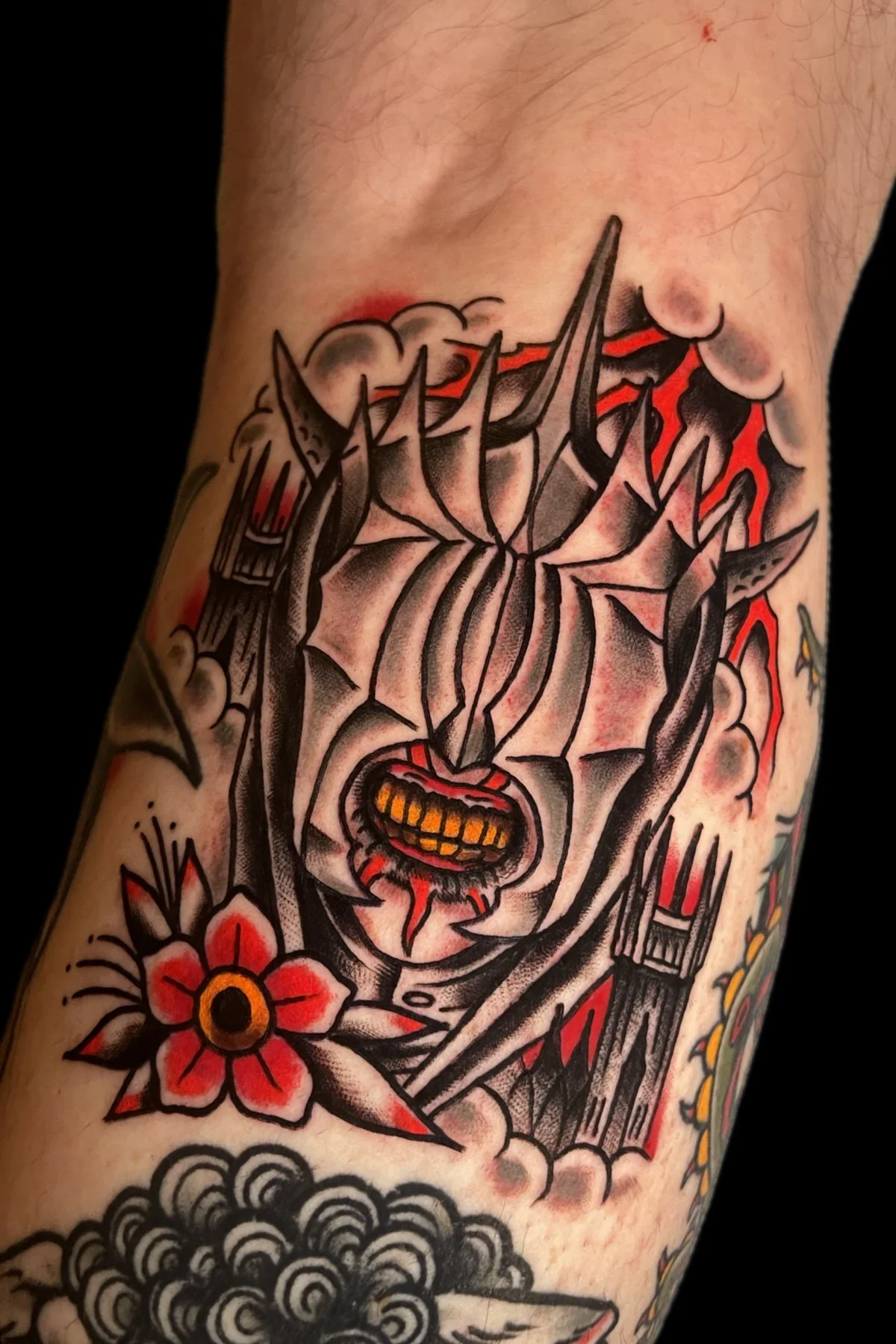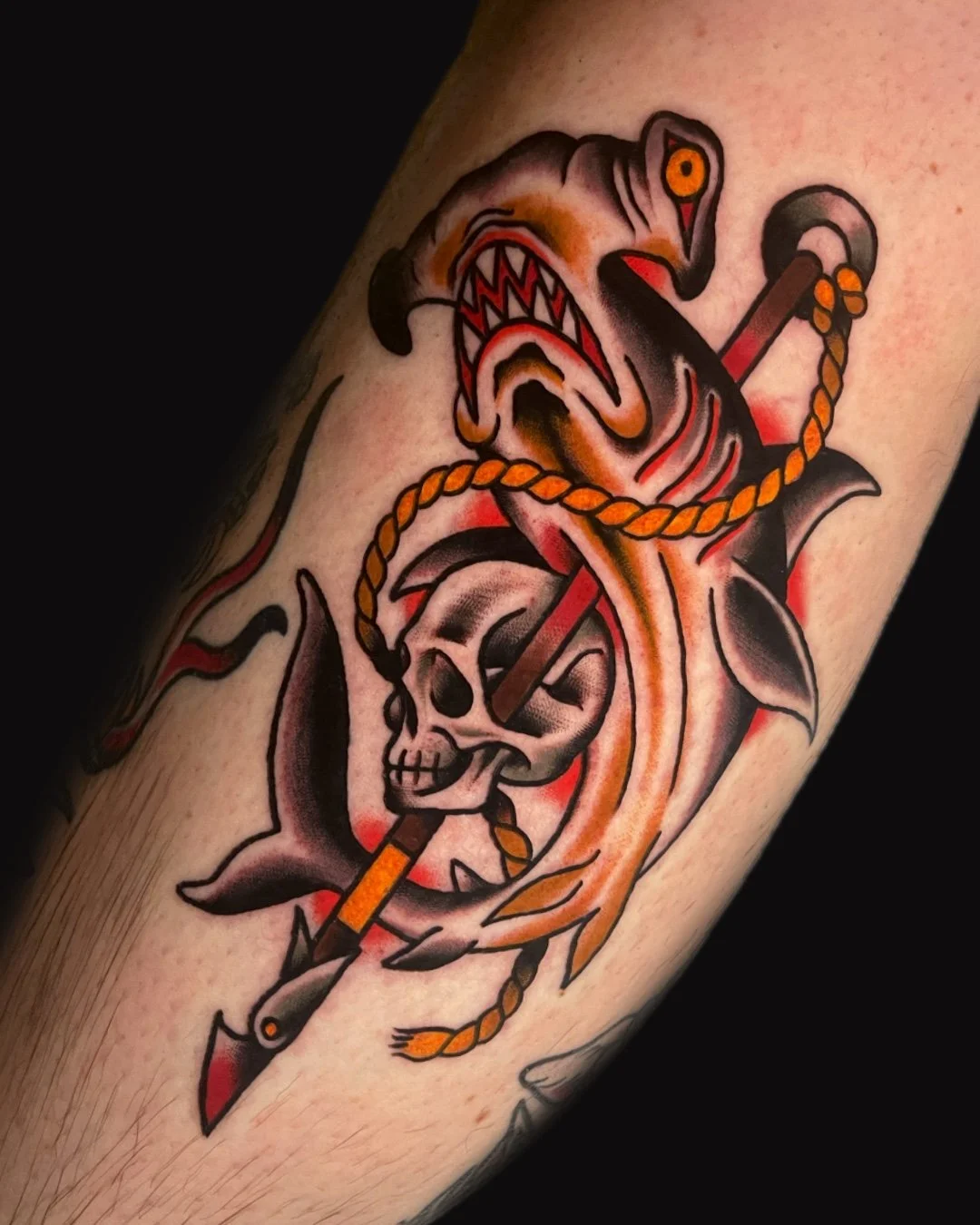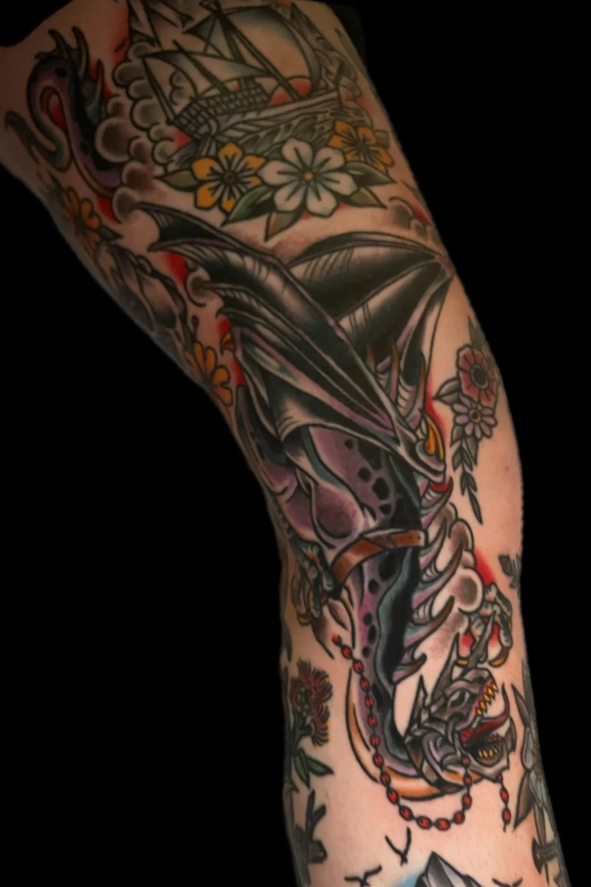Tattoo design featuring a fierce dog with sharp teeth and a chain, a skull with a knife through it, and leaves, using bold colors of black, red, orange, and yellow.