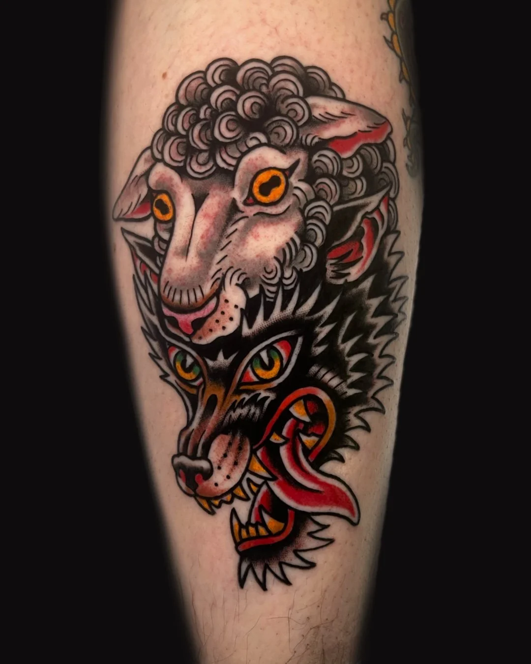 Tattoo of a wolf and a lion combined, with detailed features and vibrant colors. View fullsize