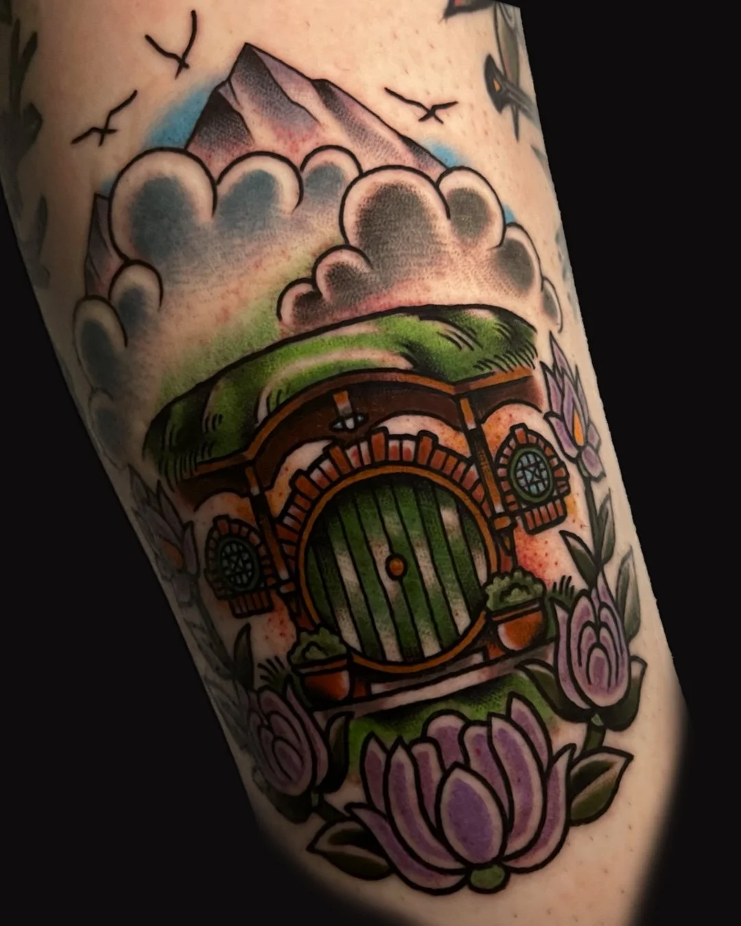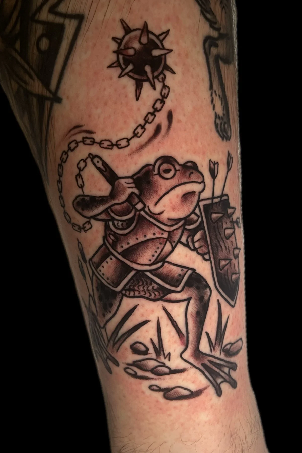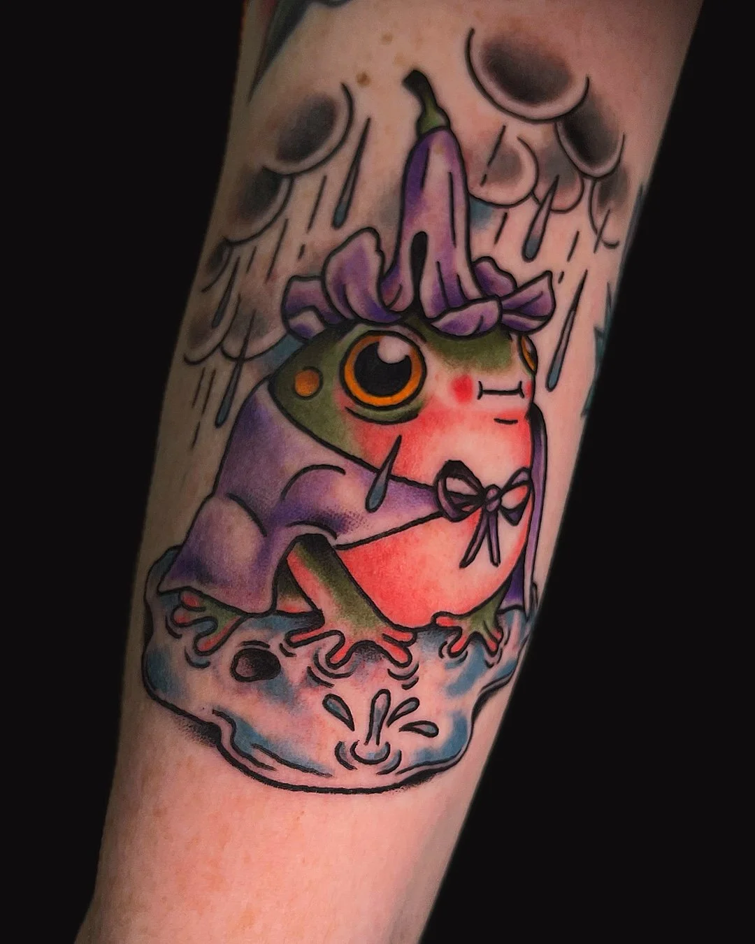 Colorful tattoo of a frog with large eyes wearing a purple hat and a bow, sitting on a clothed stone with water splashing around, rain falling, and a purple flower above its head.