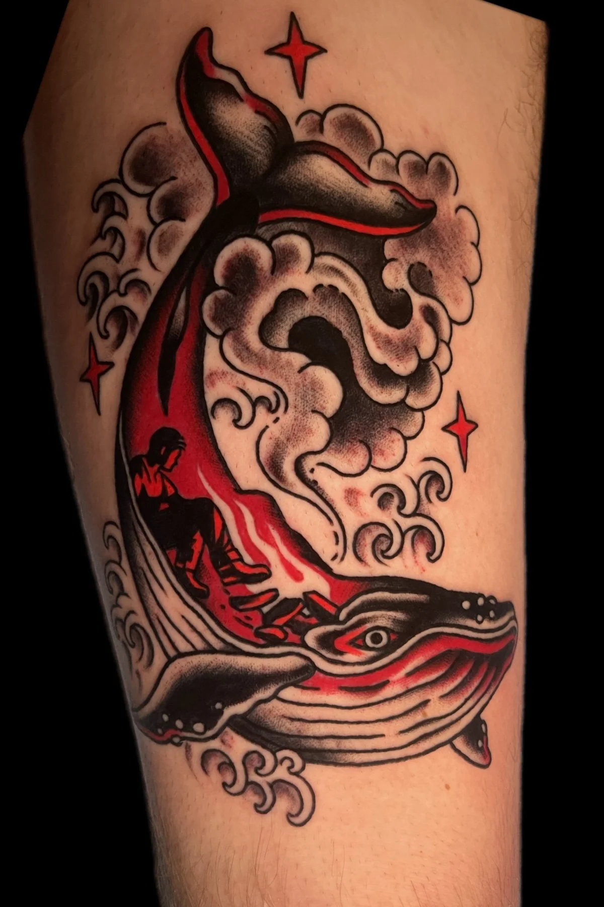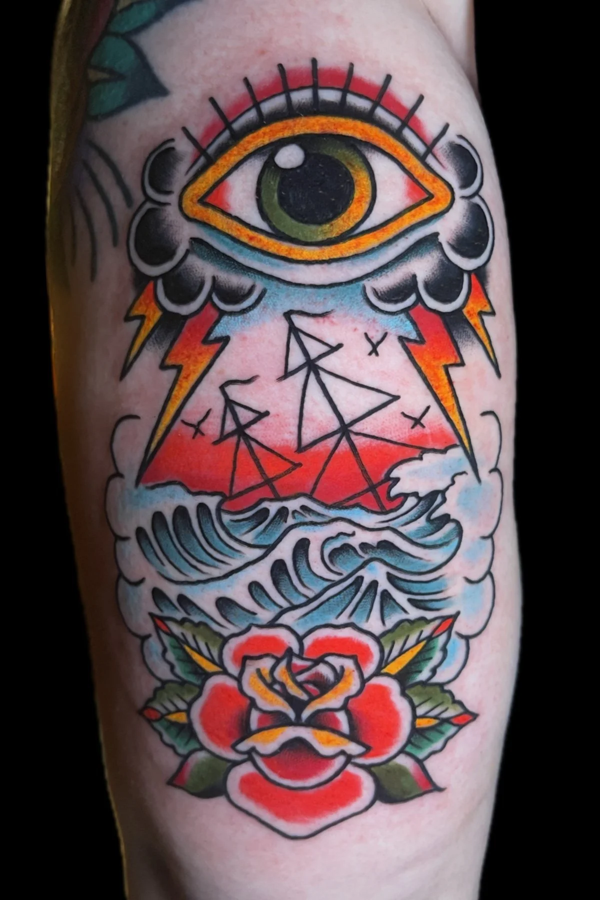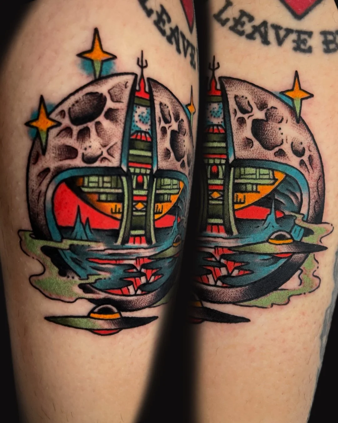 A tattoo of the Space Needle with a full moon in the background, surrounded by stars and stylized water below.