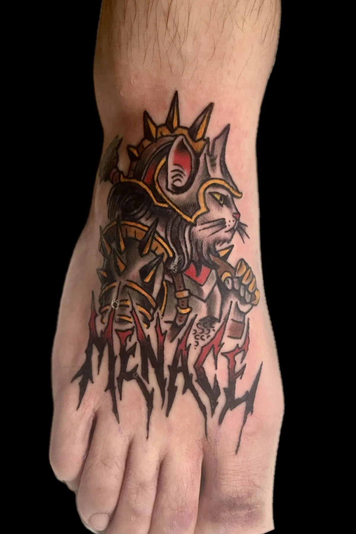 Tattoo of a lion with a crown, wearing armor, and with the name 'Menae' in stylized letters.