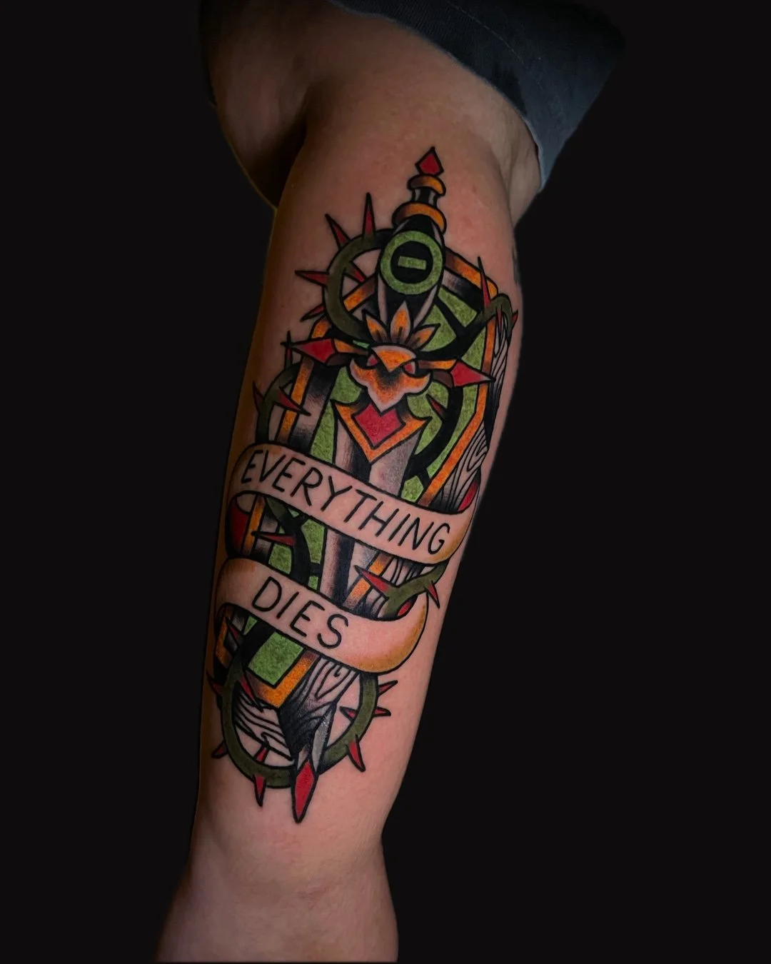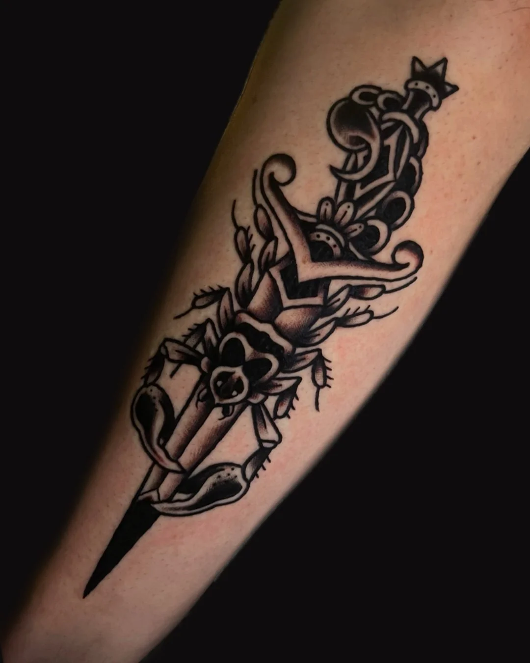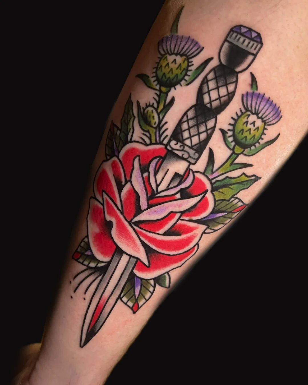 Tattoo of a red rose, green leaves, and thistle flowers surrounding a dagger with a patterned handle, all in traditional tattoo style.
