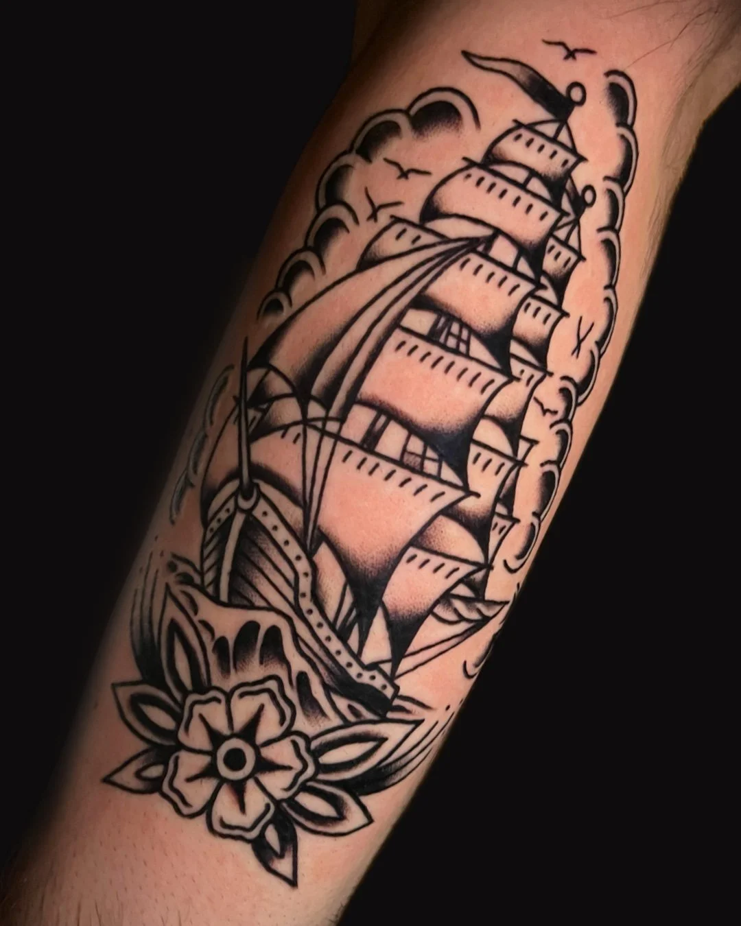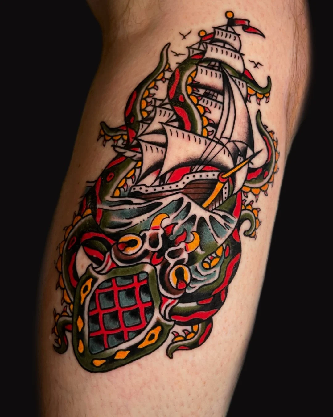 Tattoo of a sailing ship on an octopus with tentacles wrapping around a heart with a grid pattern