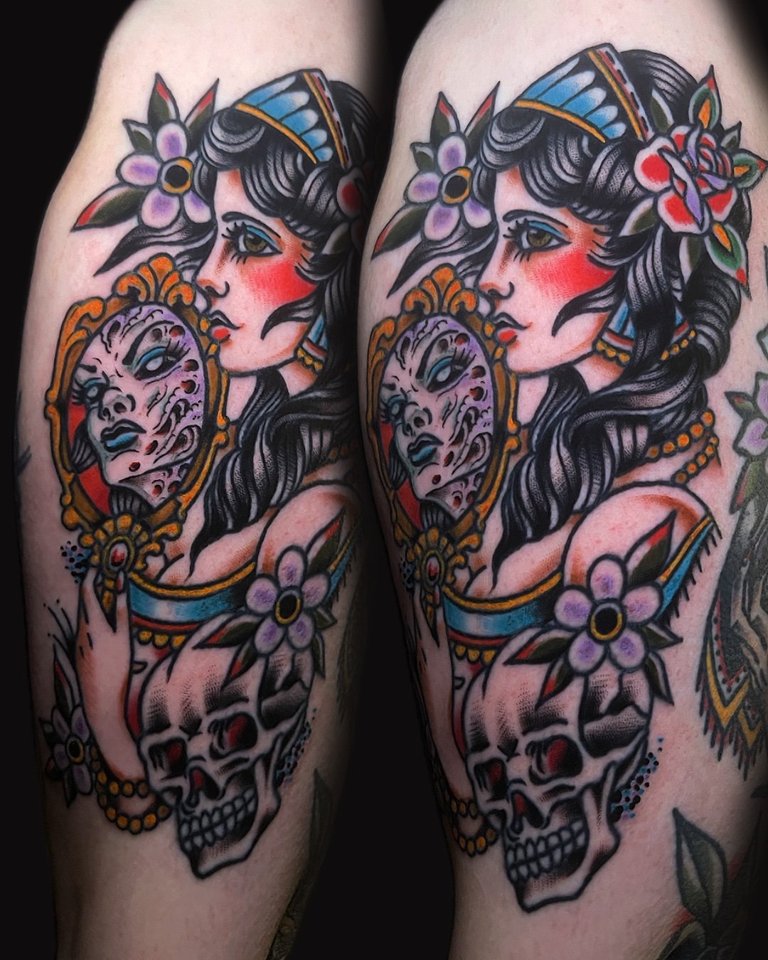 Tattoo of a woman with dark hair, flowers, a skull, and a decorative mirror on the arm. View fullsize