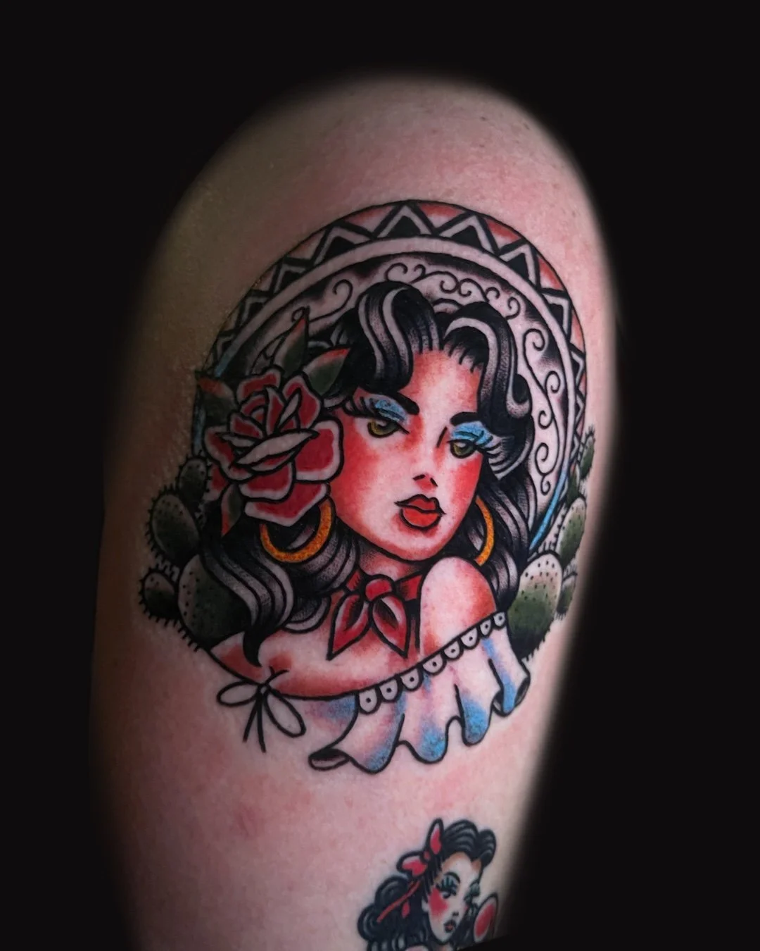 Tattoo of a woman with dark hair, large earrings, a wide-brimmed hat, red flower in her hair, and an off-shoulder dress, with a cactus background.