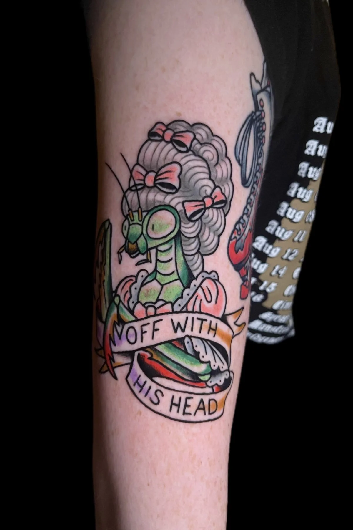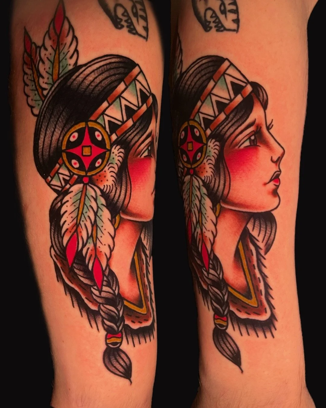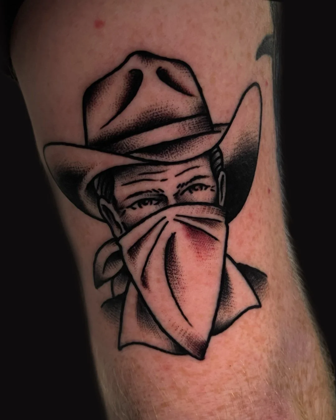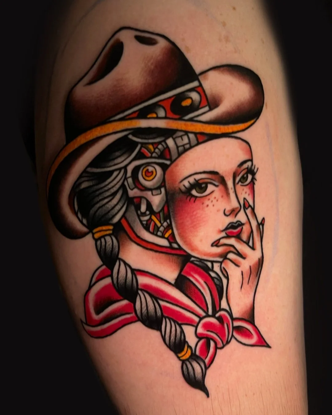 Tattoo of a woman with a braid, wearing a cowboy hat, holding a finger to her lips, in a colorful, illustrative style.