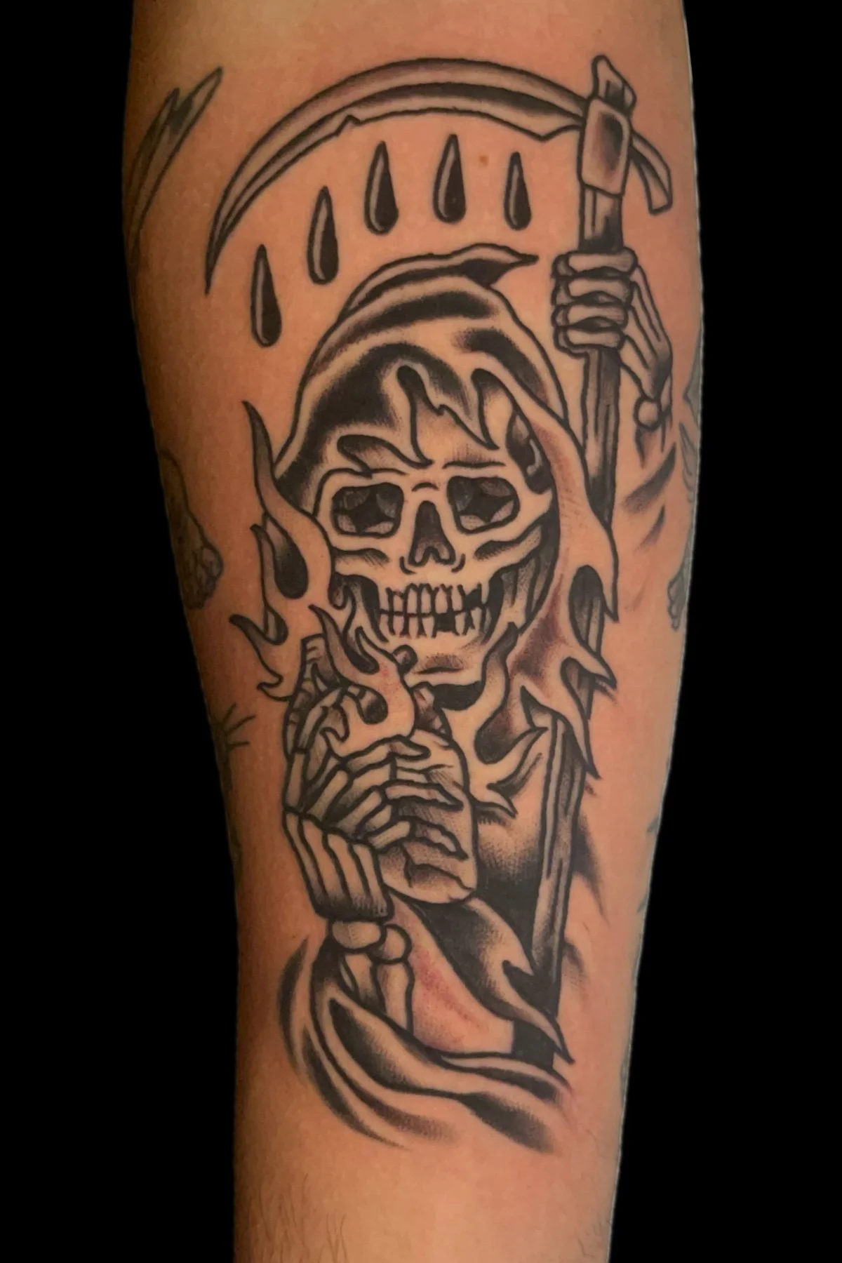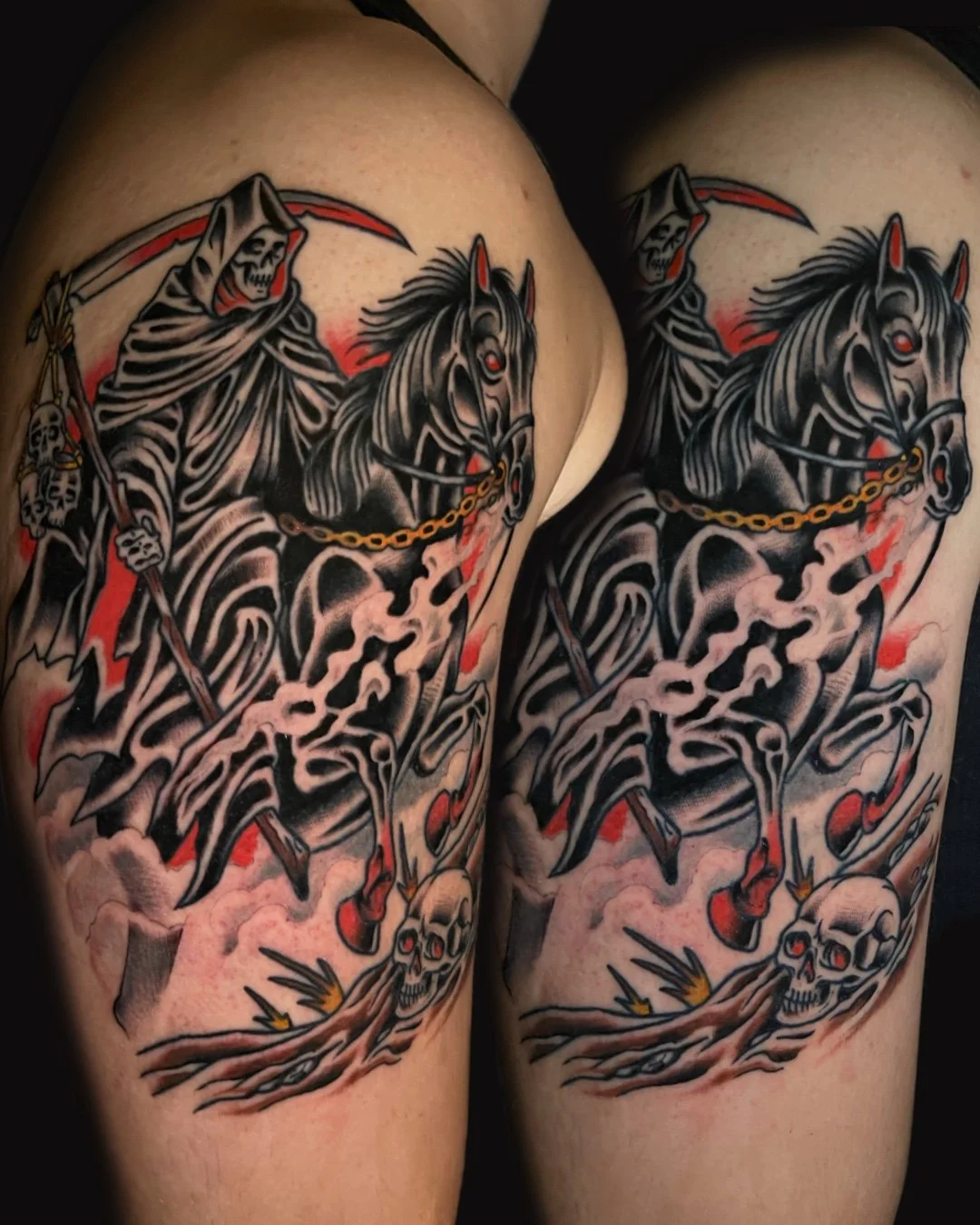 Tattoo of Grim Reaper figure with a scythe on a horse, wielding a sword, with skulls and a red background.