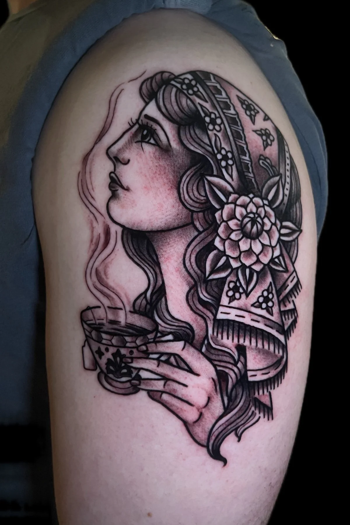 Tattoo of a woman with dark hair, flowers, a skull, and a decorative mirror on the arm.