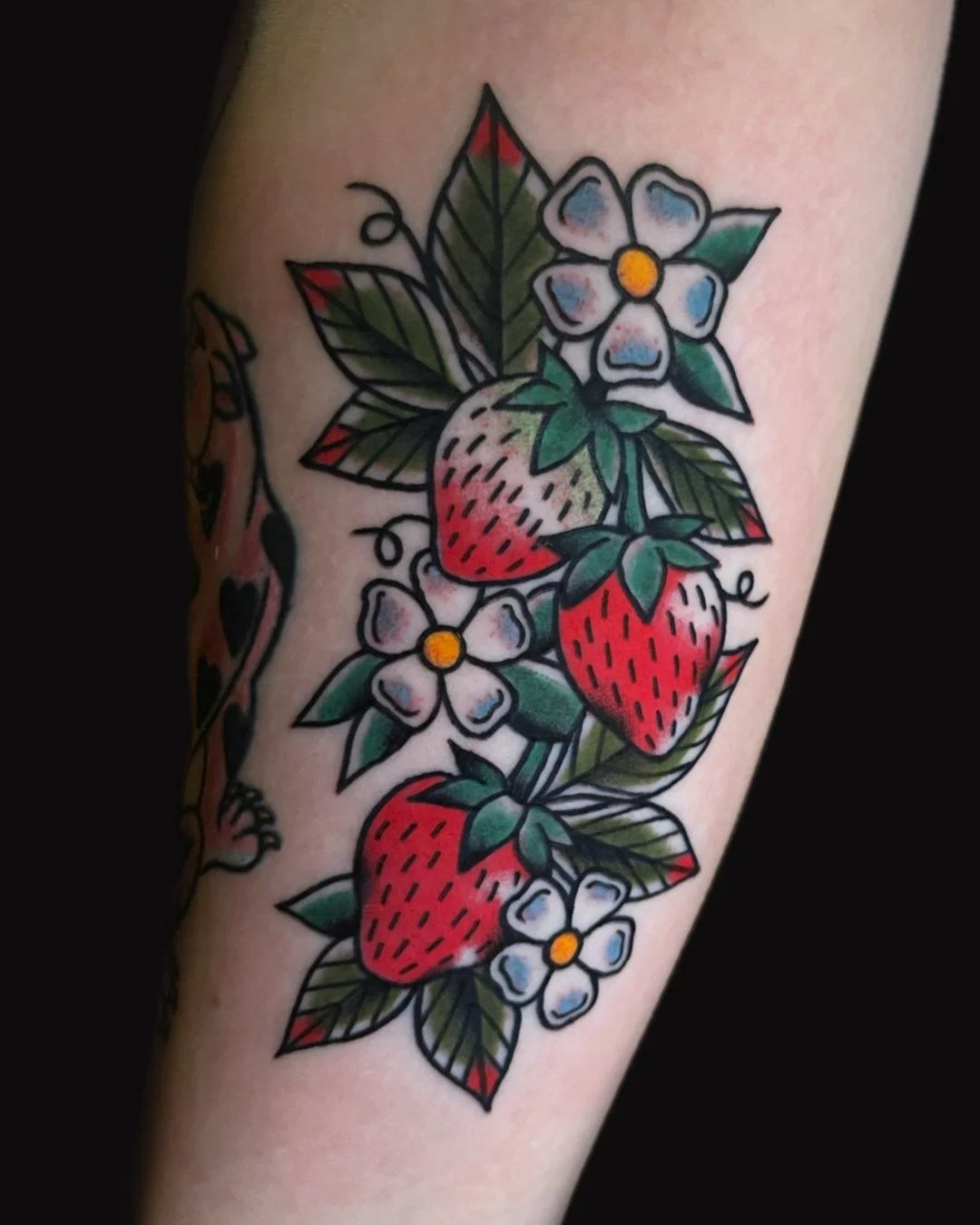 Colorful tattoo of strawberries and white flowers with yellow centers on someone's skin.