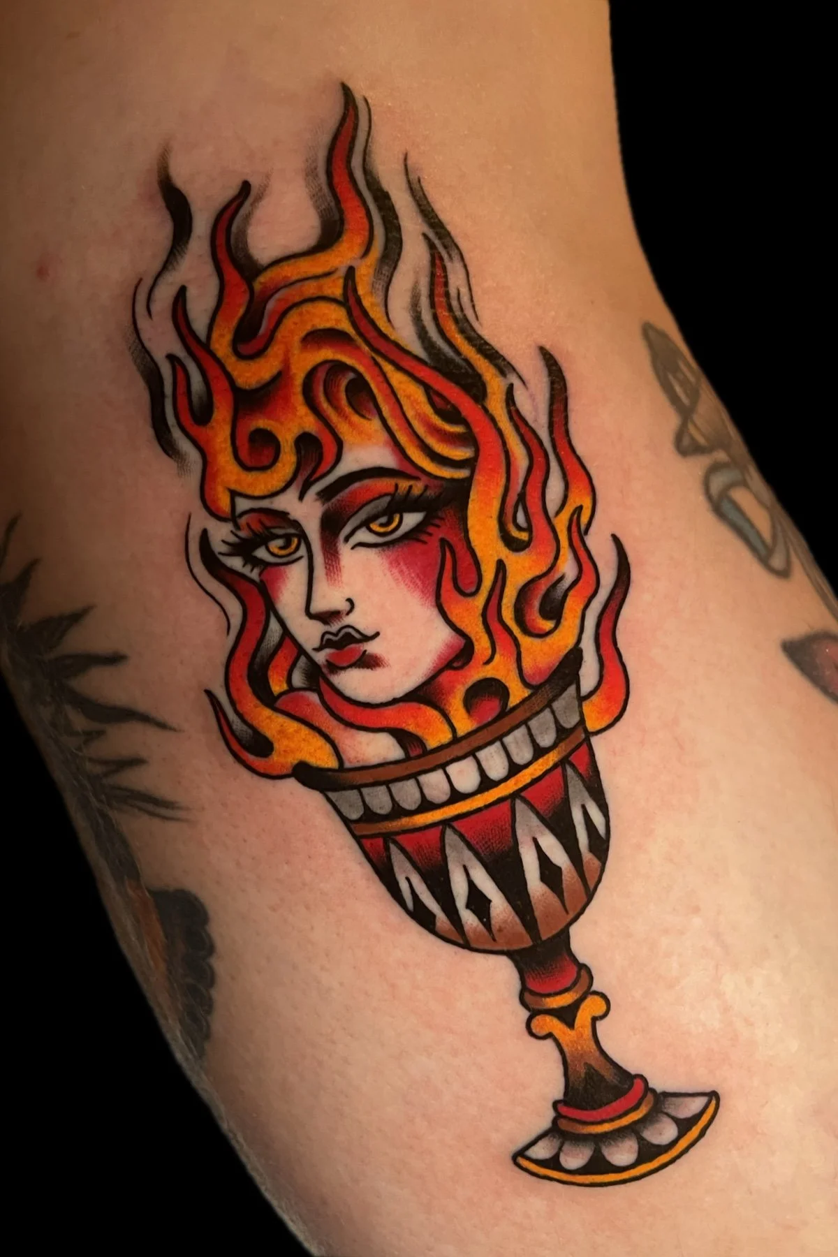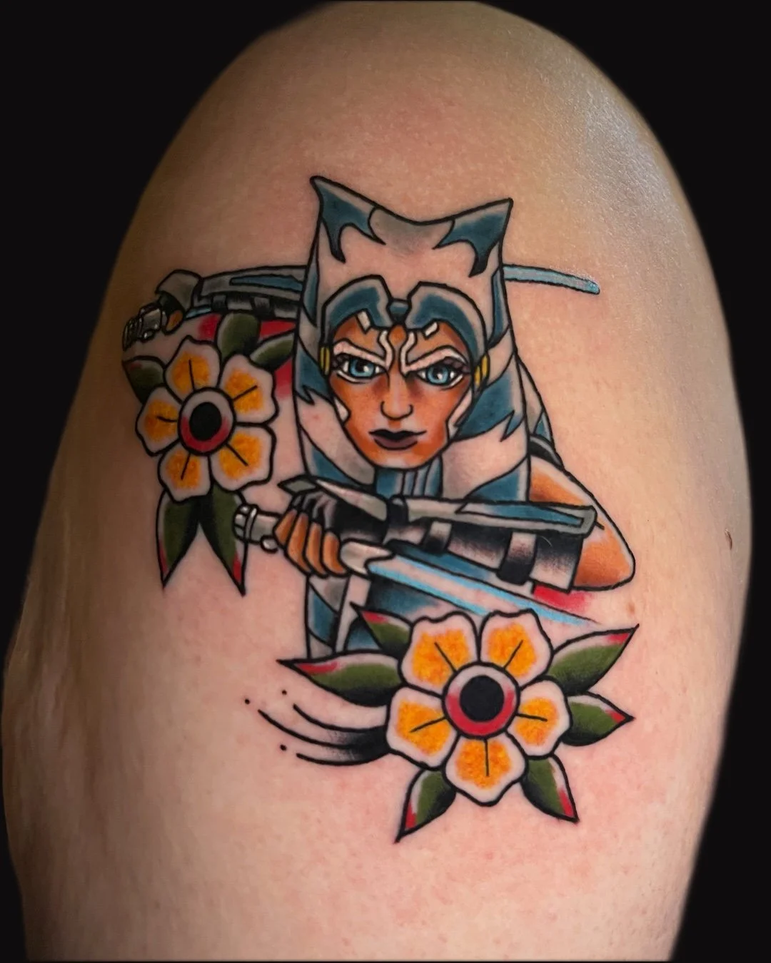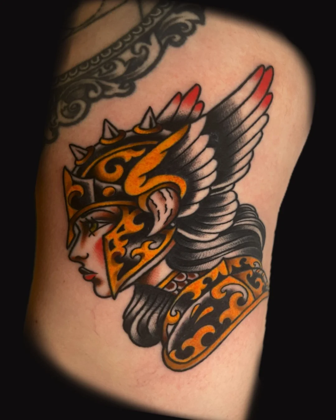 Tattoo of a woman's face wearing a winged helmet with orange and black designs, and a black and orange armored shoulder piece.