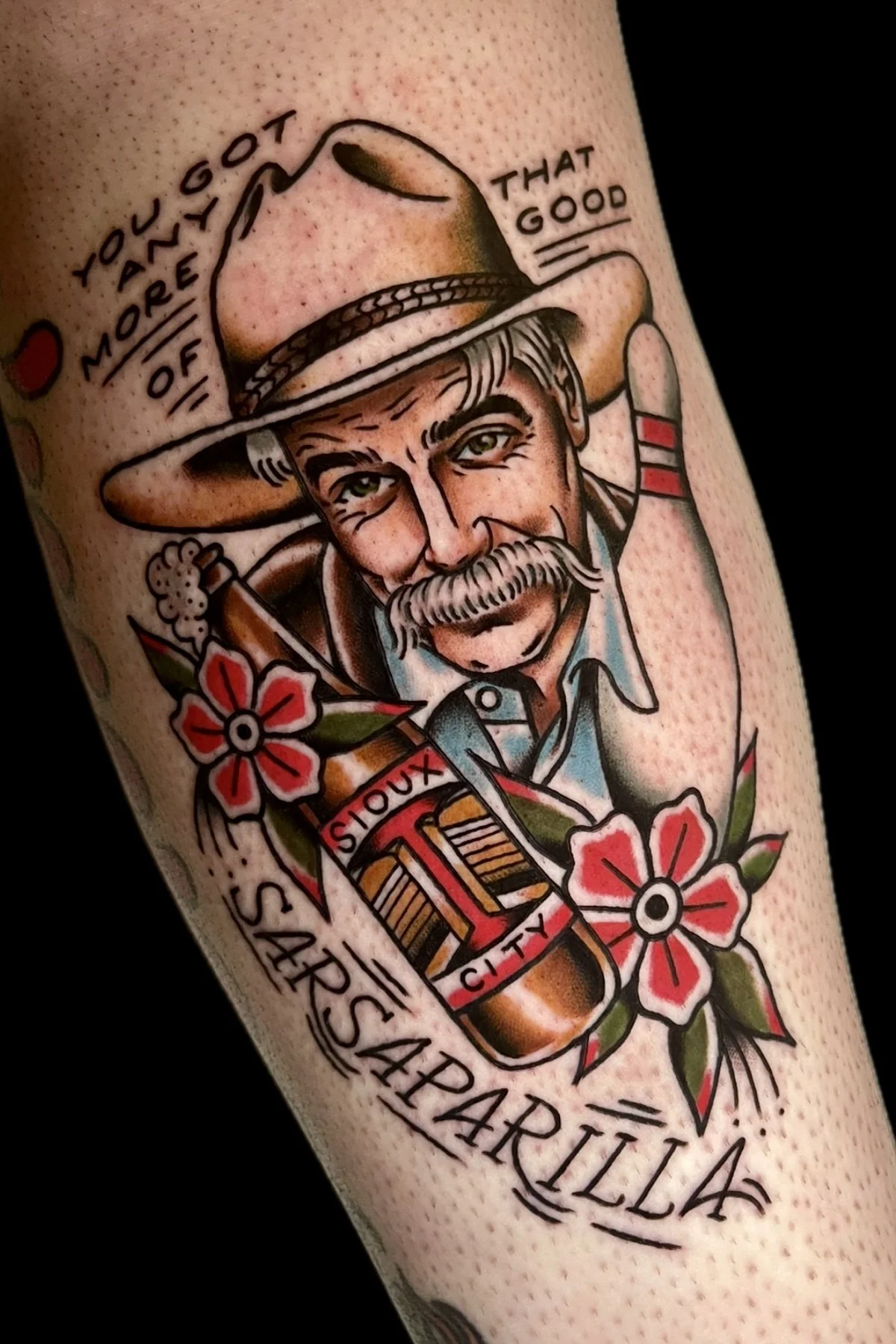 Tattoo of an older man with a mustache wearing a hat, surrounded by flowers, a bottle labeled 'Sloeux', and the text 'You got more of that good' and 'Sarsaparilla'.