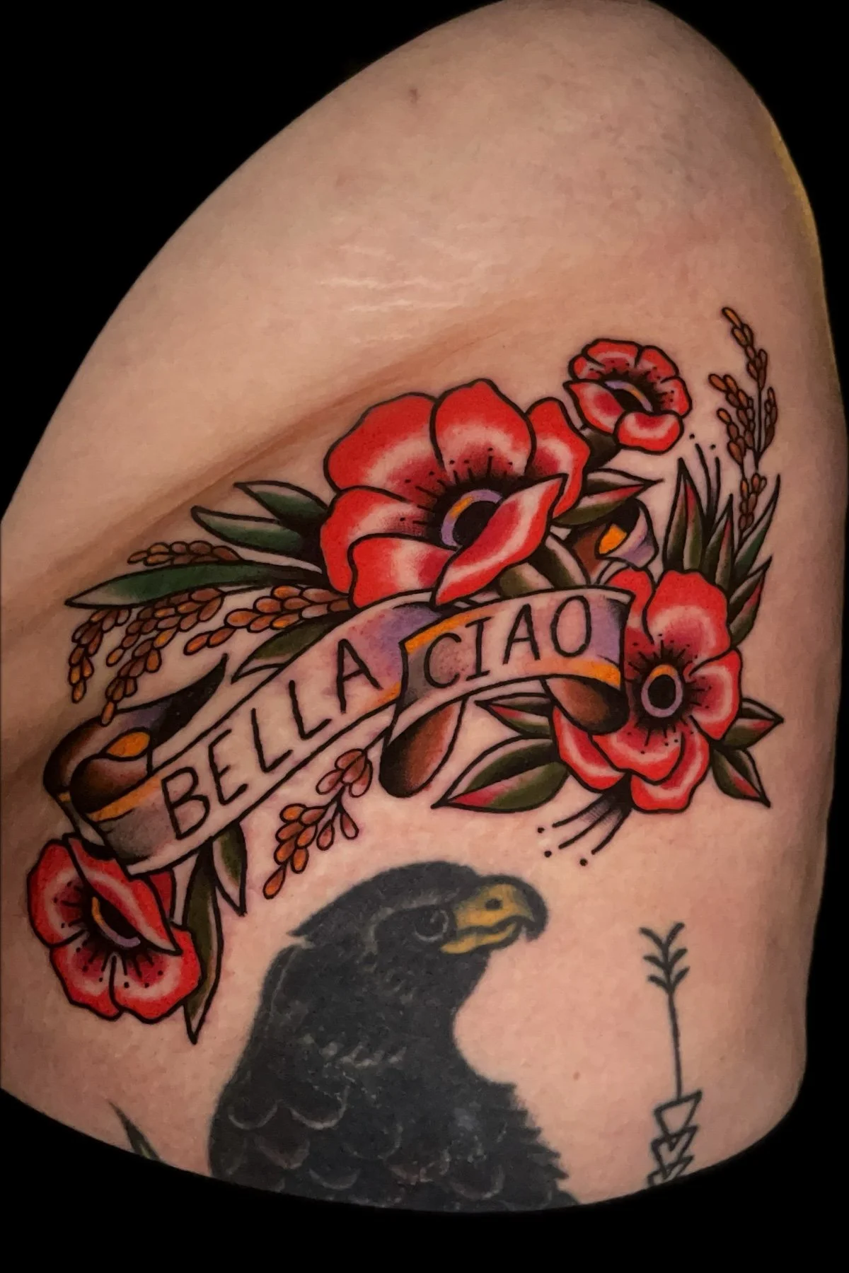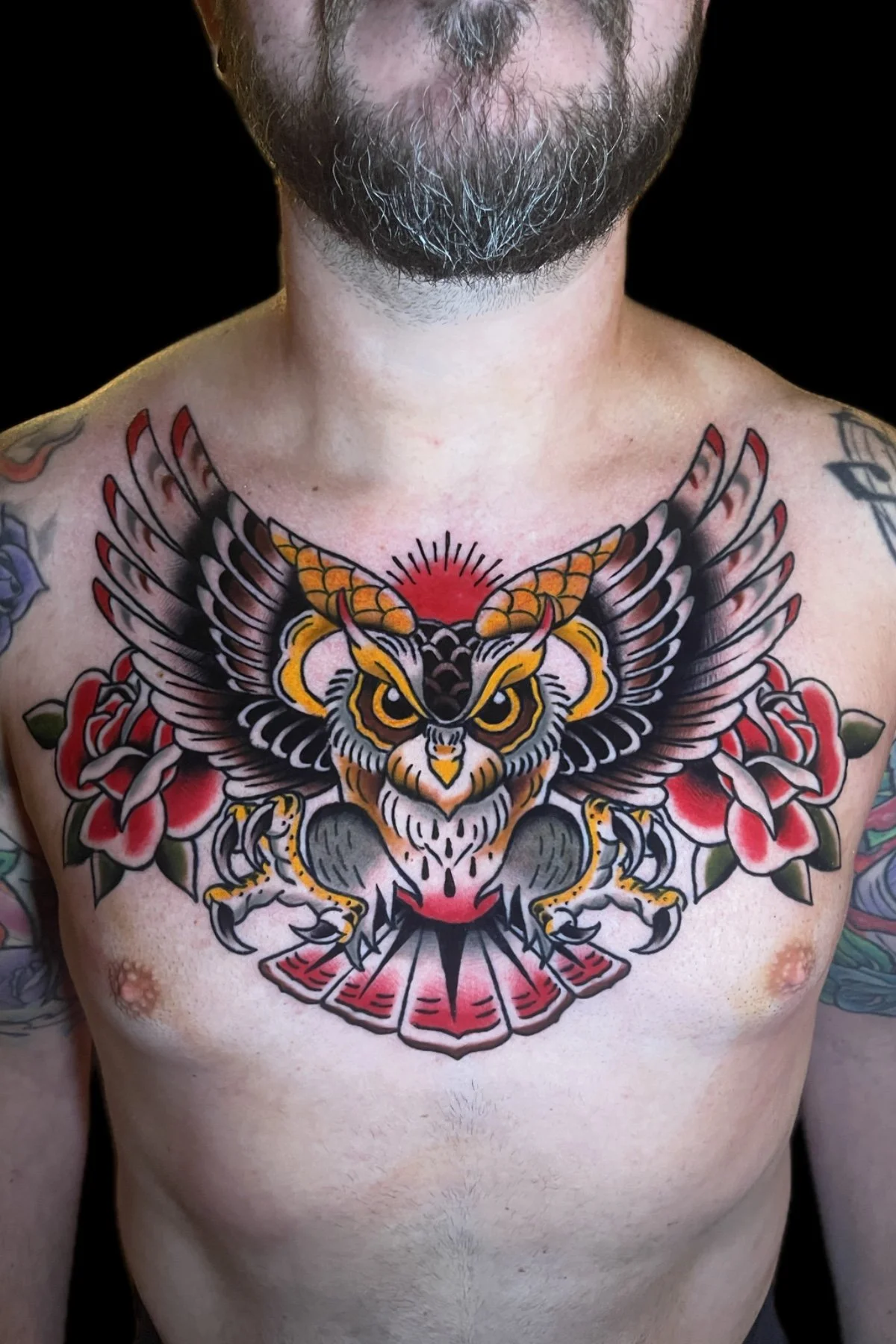 Colorful tattoo of an owl with wings spread across the chest, surrounded by red roses.
