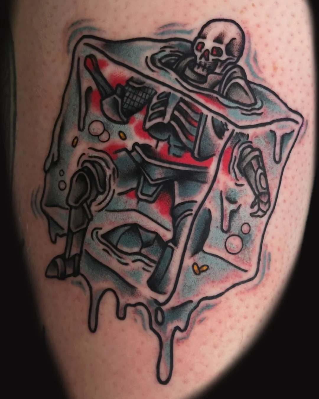Tattoo of a grim reaper riding a motorcycle with a skull on the front, surrounded by smoke.