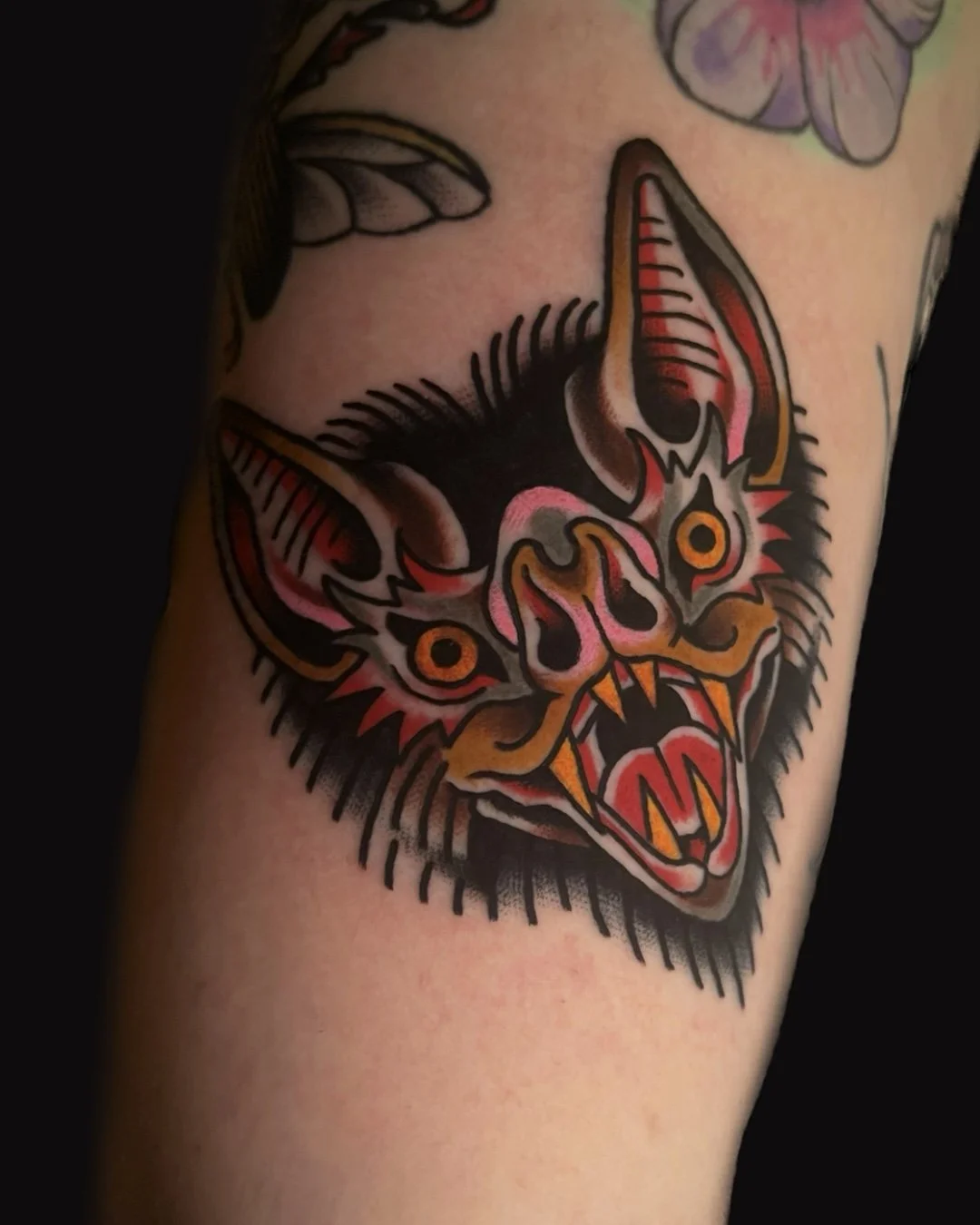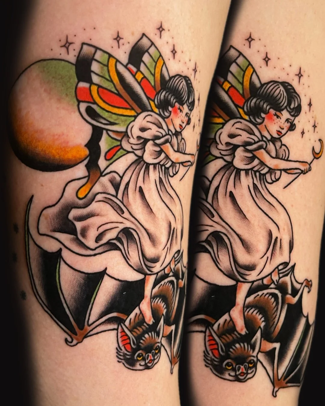 Tattoo of a girl with butterfly wings holding a broomstick, accompanied by a bat with yellow eyes, on human skin.