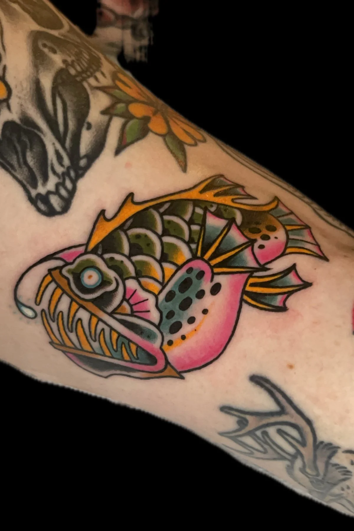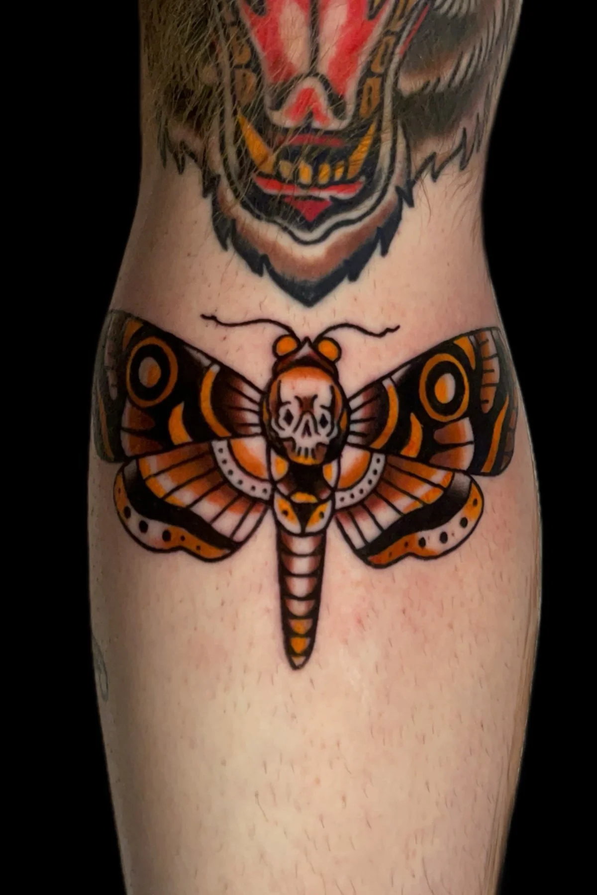 Tattoo of a colorful moth with a skull on its face, located on a person's upper arm.