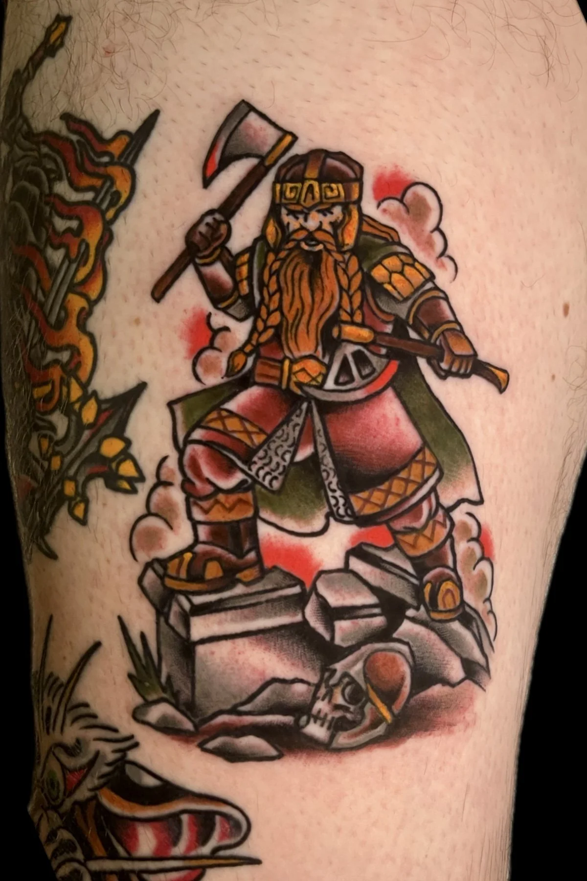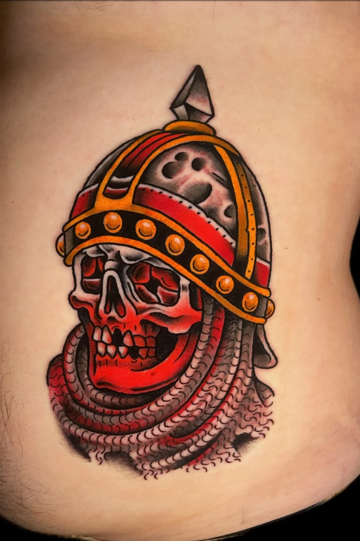 Tattoo of a woman's face wearing a winged helmet with orange and black designs, and a black and orange armored shoulder piece. View fullsize
