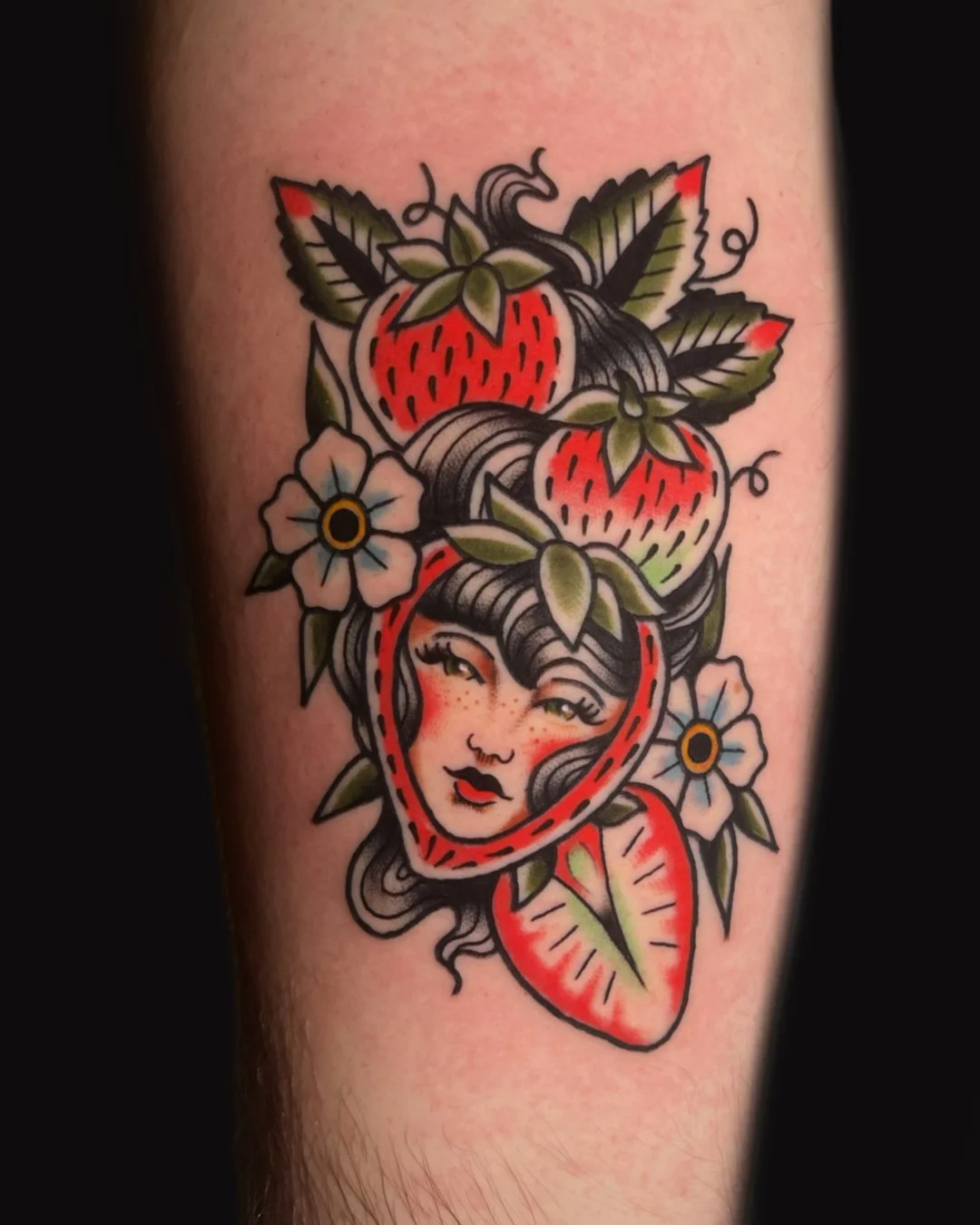 Tattoo of a woman's face in a traditional style, surrounded by strawberries, strawberry leaves, and flowers with yellow centers.