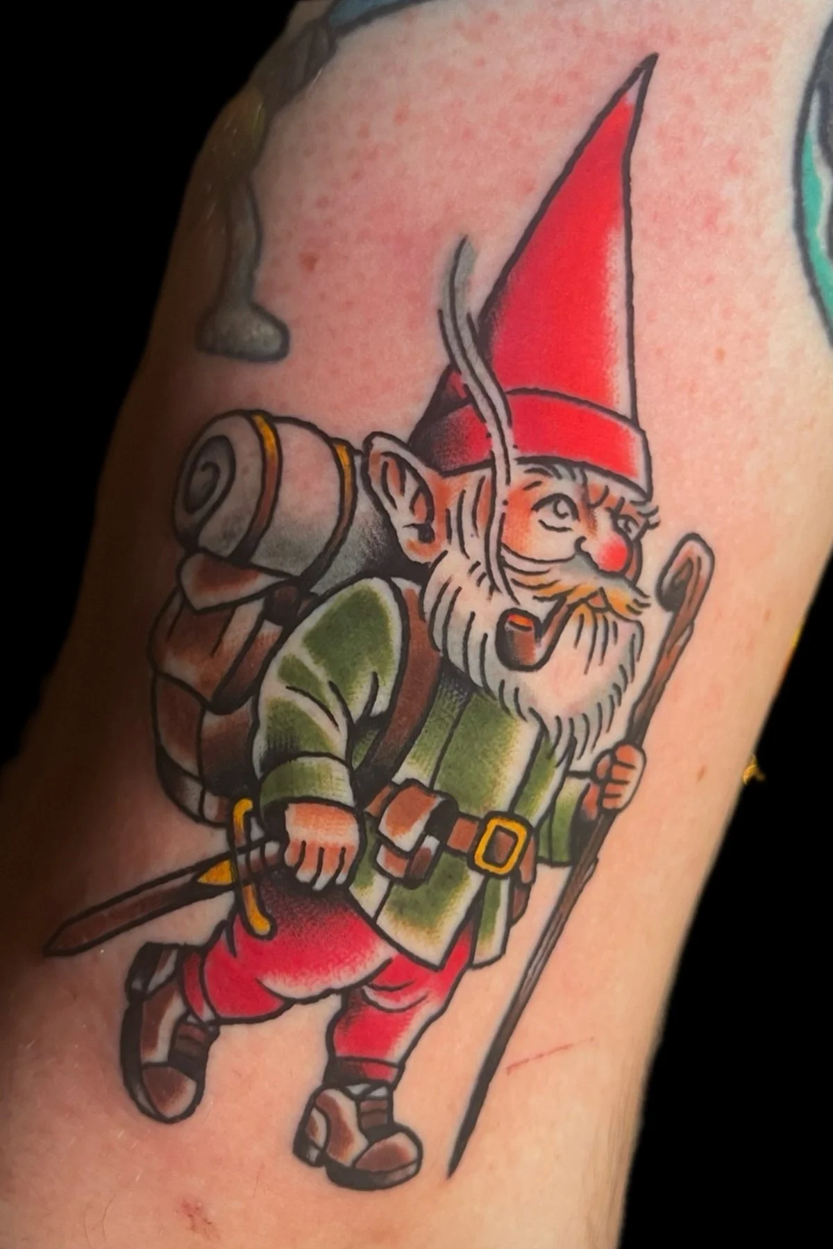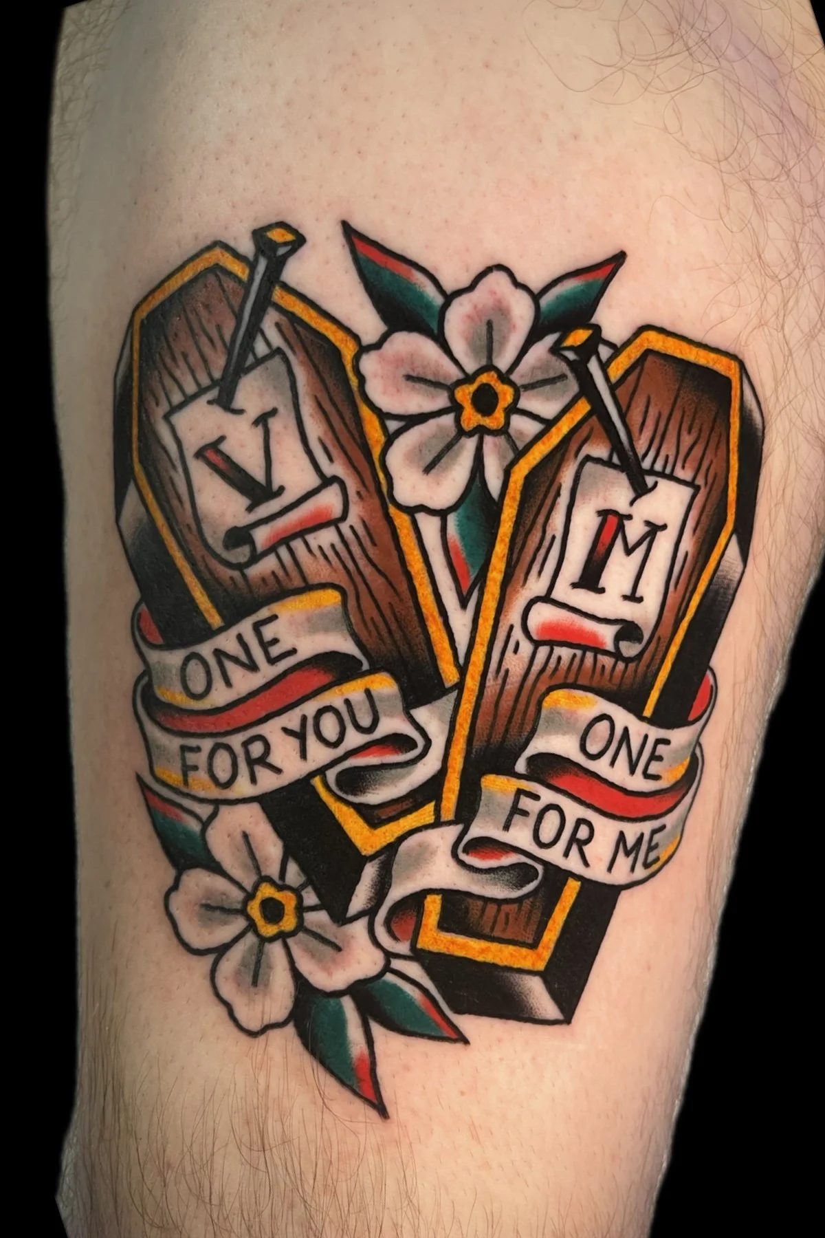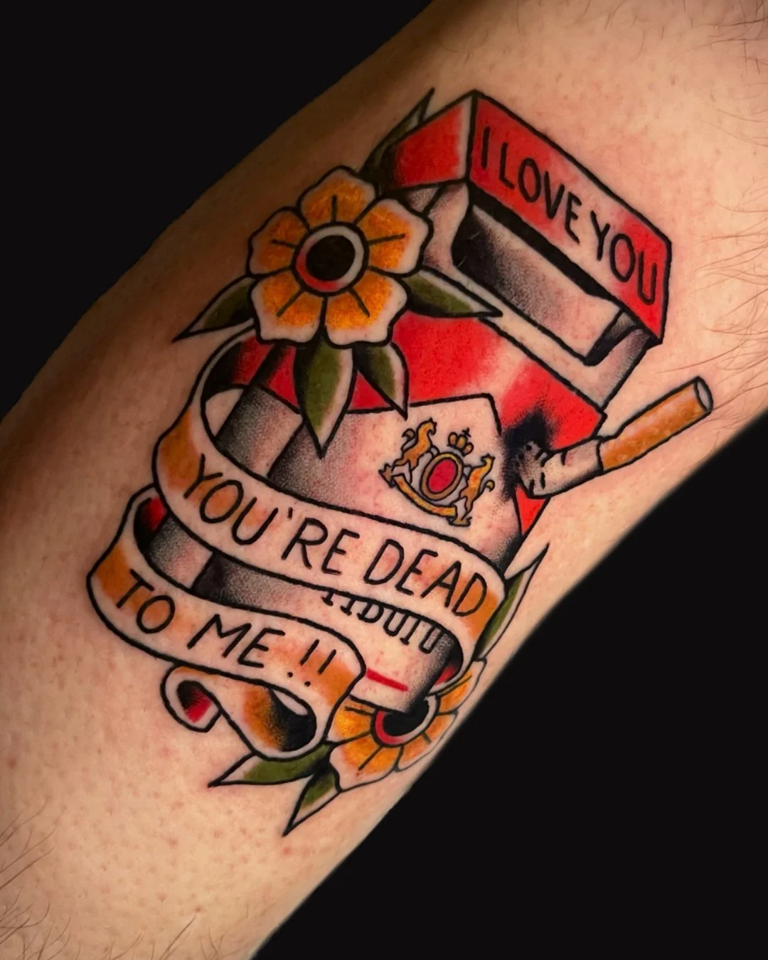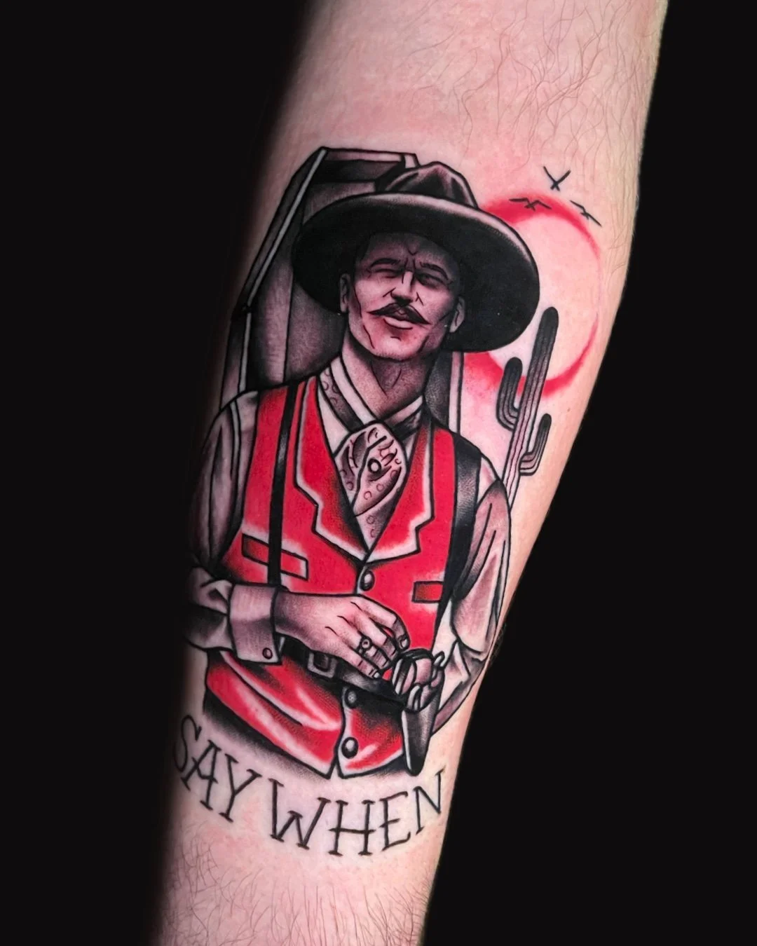 Tattoo of a man with a mustache and a large hat, dressed in a red vest and white shirt, holding a pistol, with the phrase 'Say When' below.