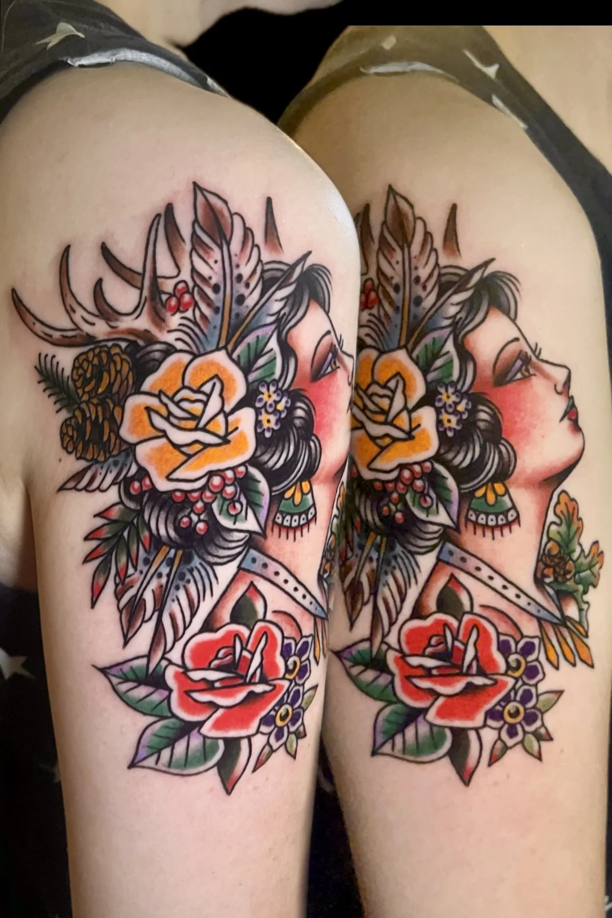 Colorful tattoo of a woman's profile surrounded by flowers, feathers, and leaves on the upper arm.