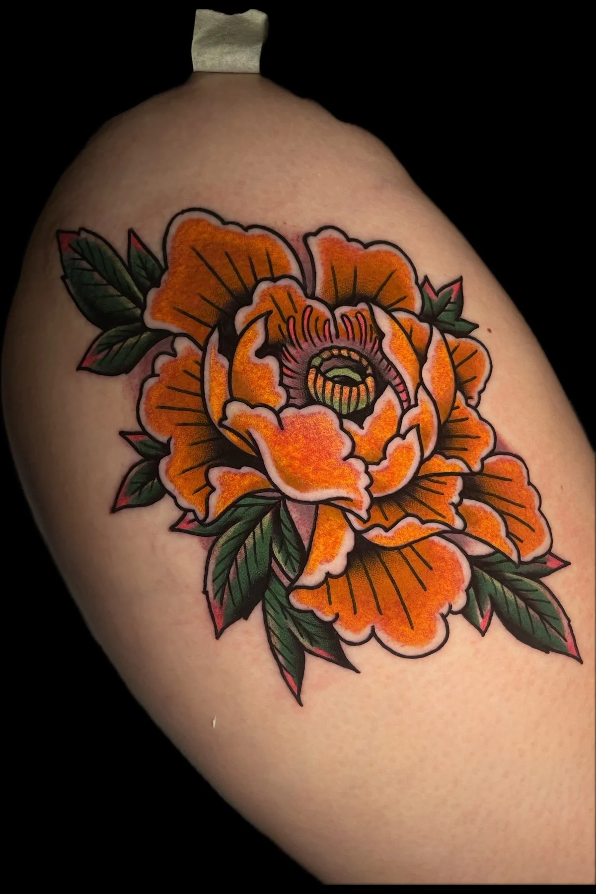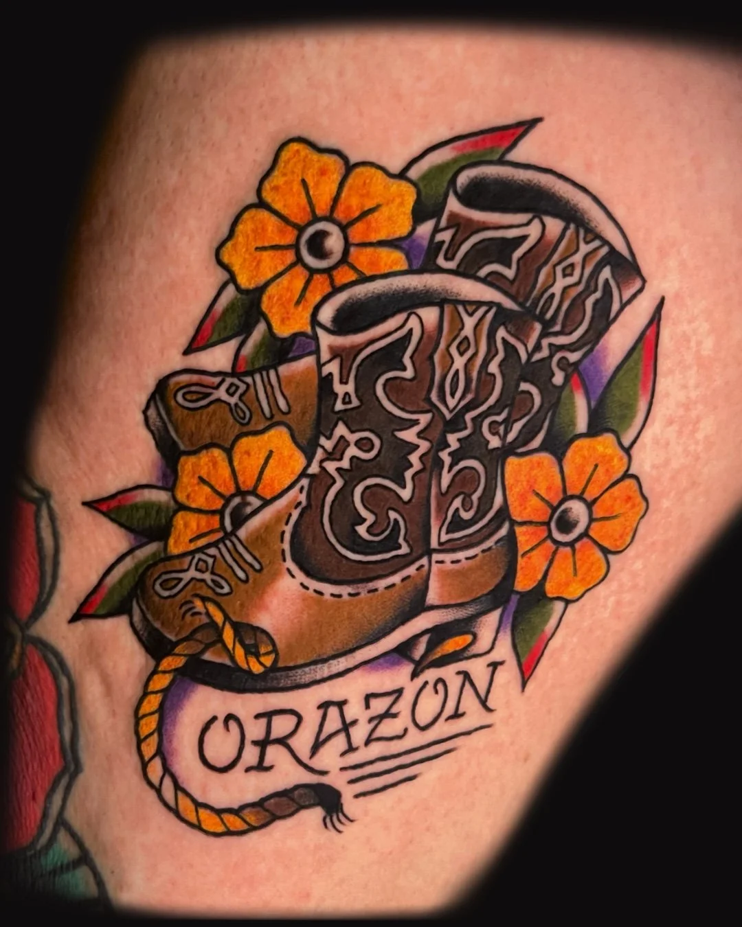 Colorful tattoo featuring a cowboy boot, orange flowers, and the word "Oregon" on skin.