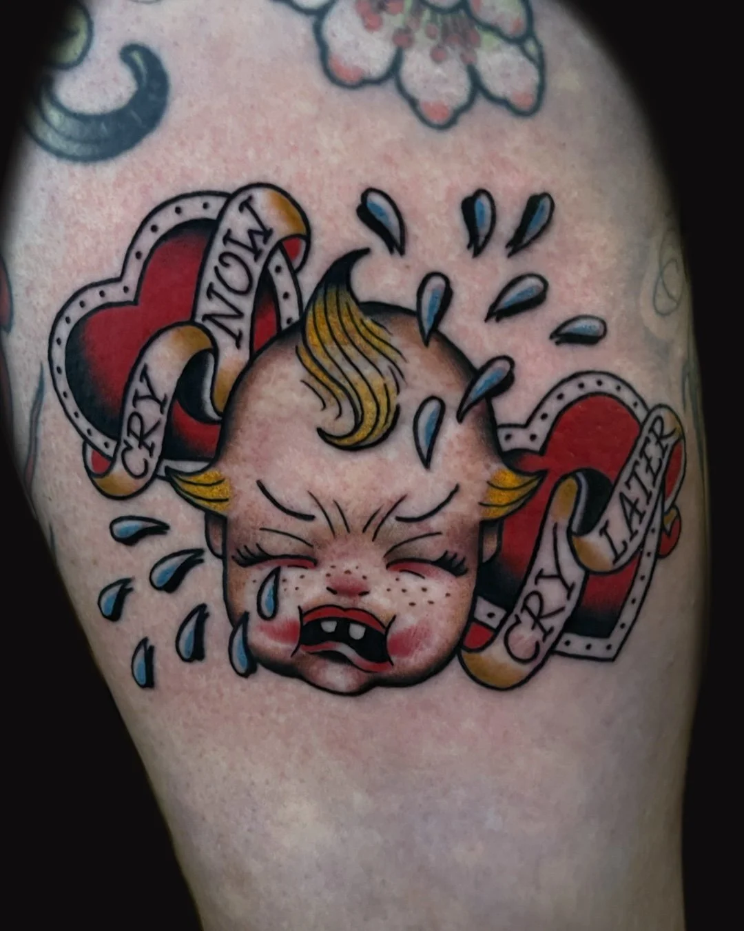 A tattoo of a crying baby with tears, freckles, and a mournful expression, surrounded by a heart-shaped banner that reads 'Cry Not My Lifer'.