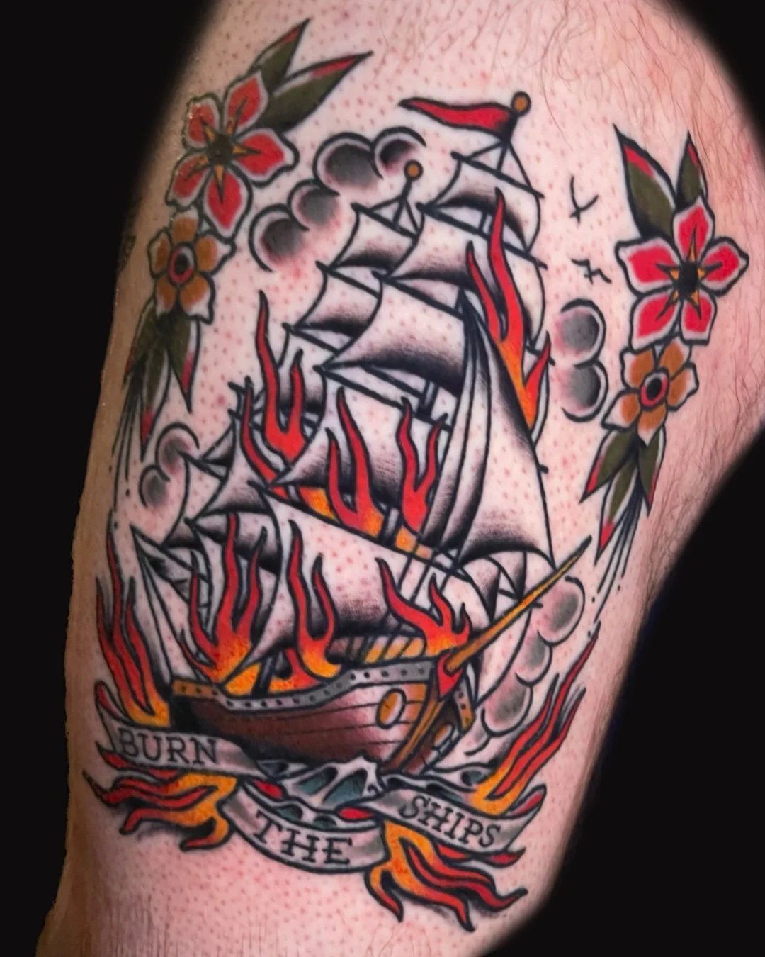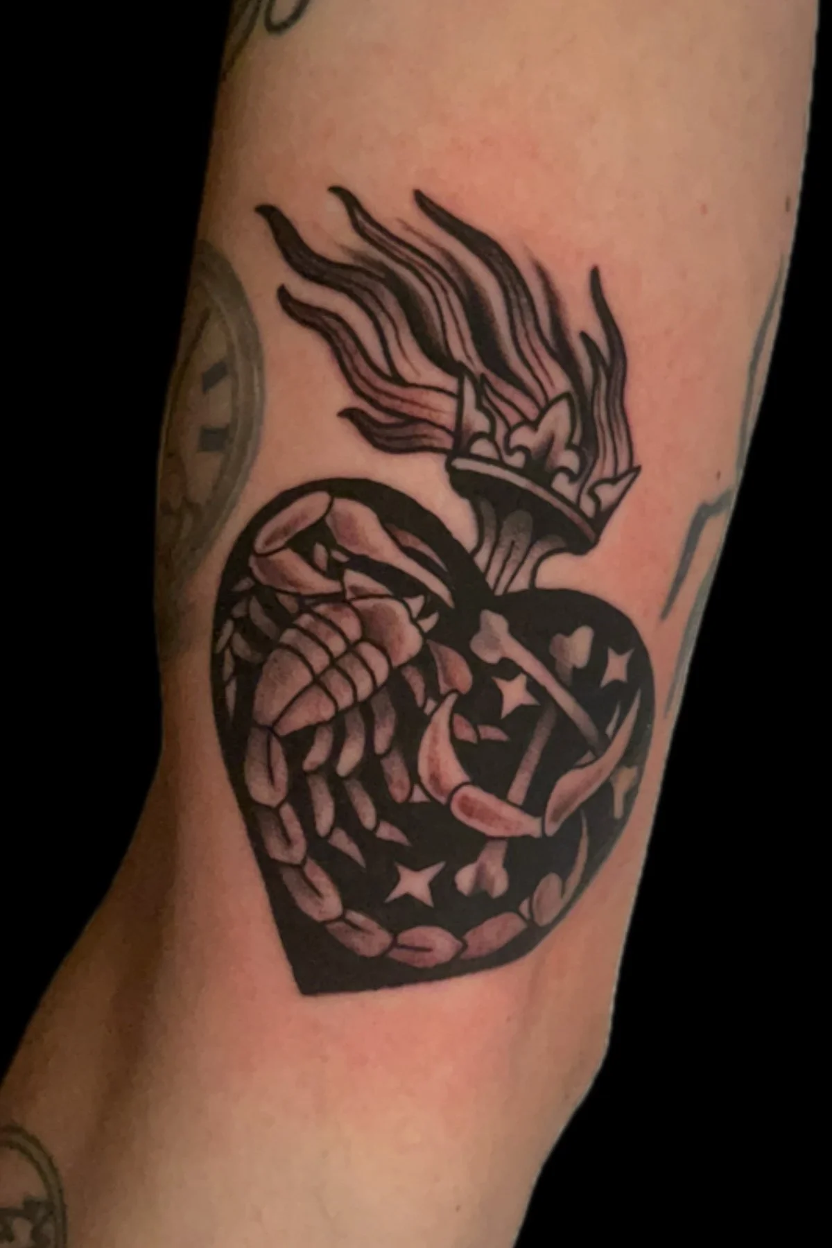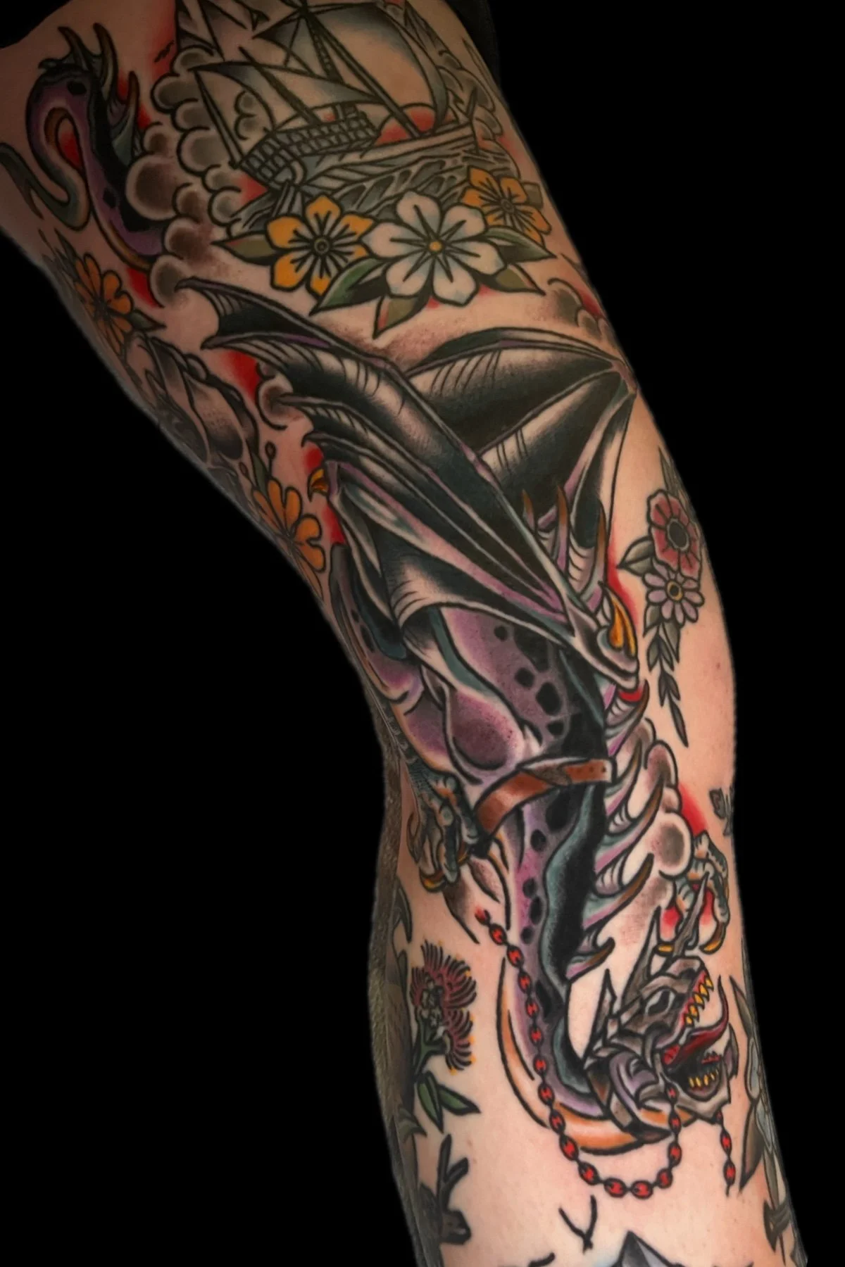 Tattoo of a sailing ship on an octopus with tentacles wrapping around a heart with a grid pattern View fullsize