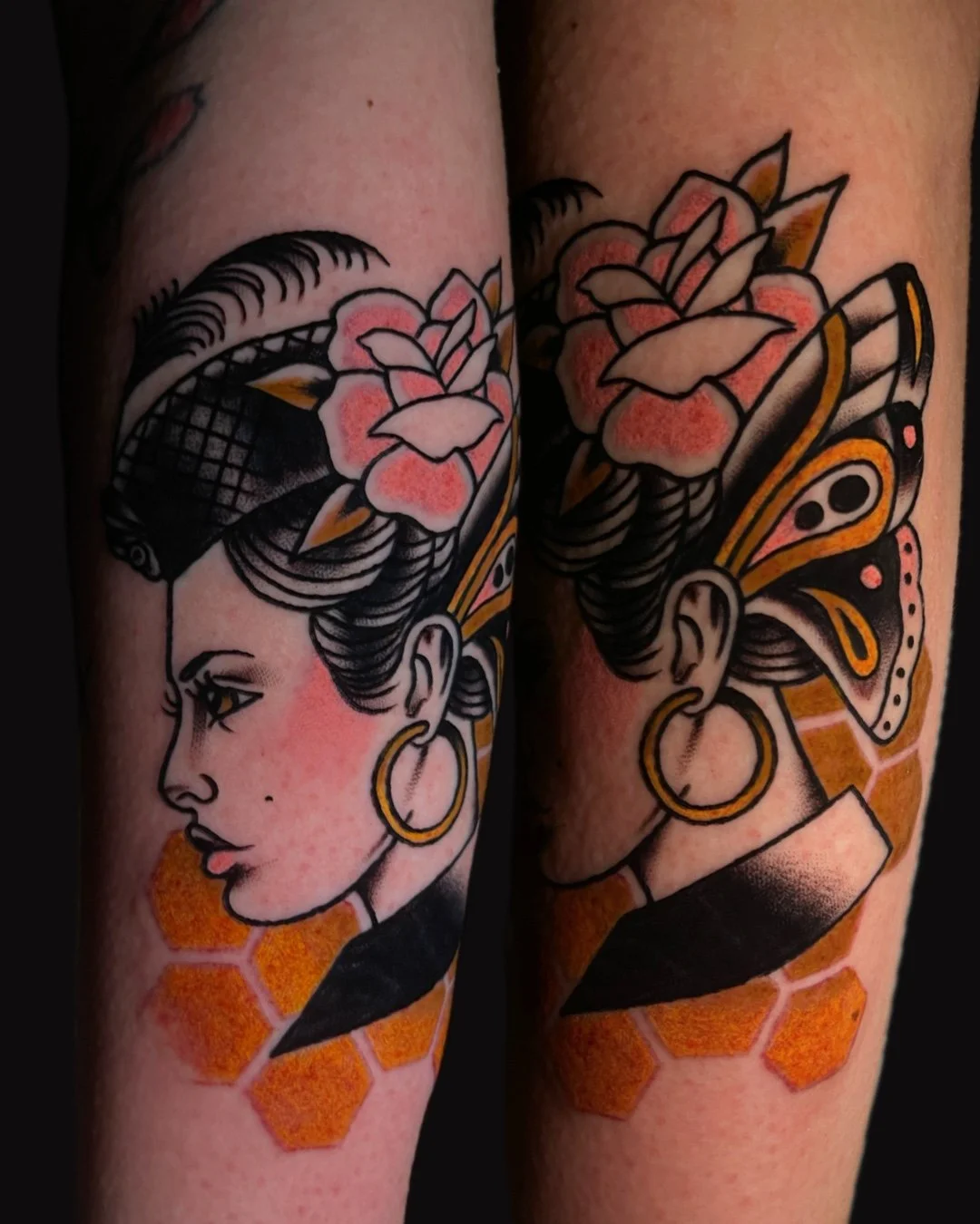 Tattoo of a woman with traditional hair and makeup, wearing a flower in her hair, gold hoop earrings, and surrounded by honeycomb patterns, with pink and black accents.