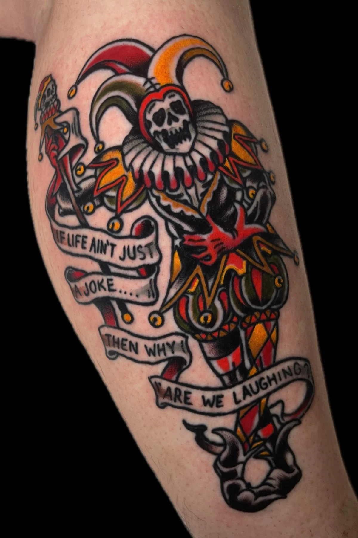 Tattoo of a jester clown with a skull face, colorful costume, and a tongue sticking out, holding a sign that reads 'If life ain't just a joke... then why are we laughing'.