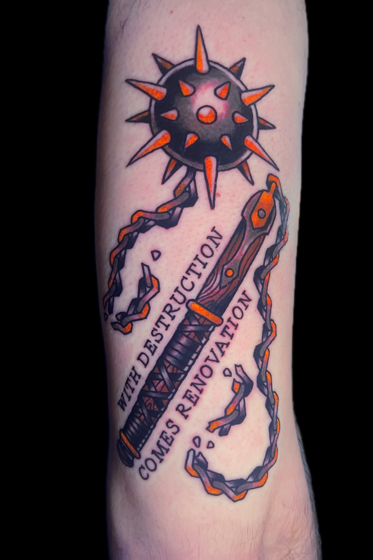 Black and gray tattoo of a spiked mace with a chain attached to a dagger on a person's arm. View fullsize