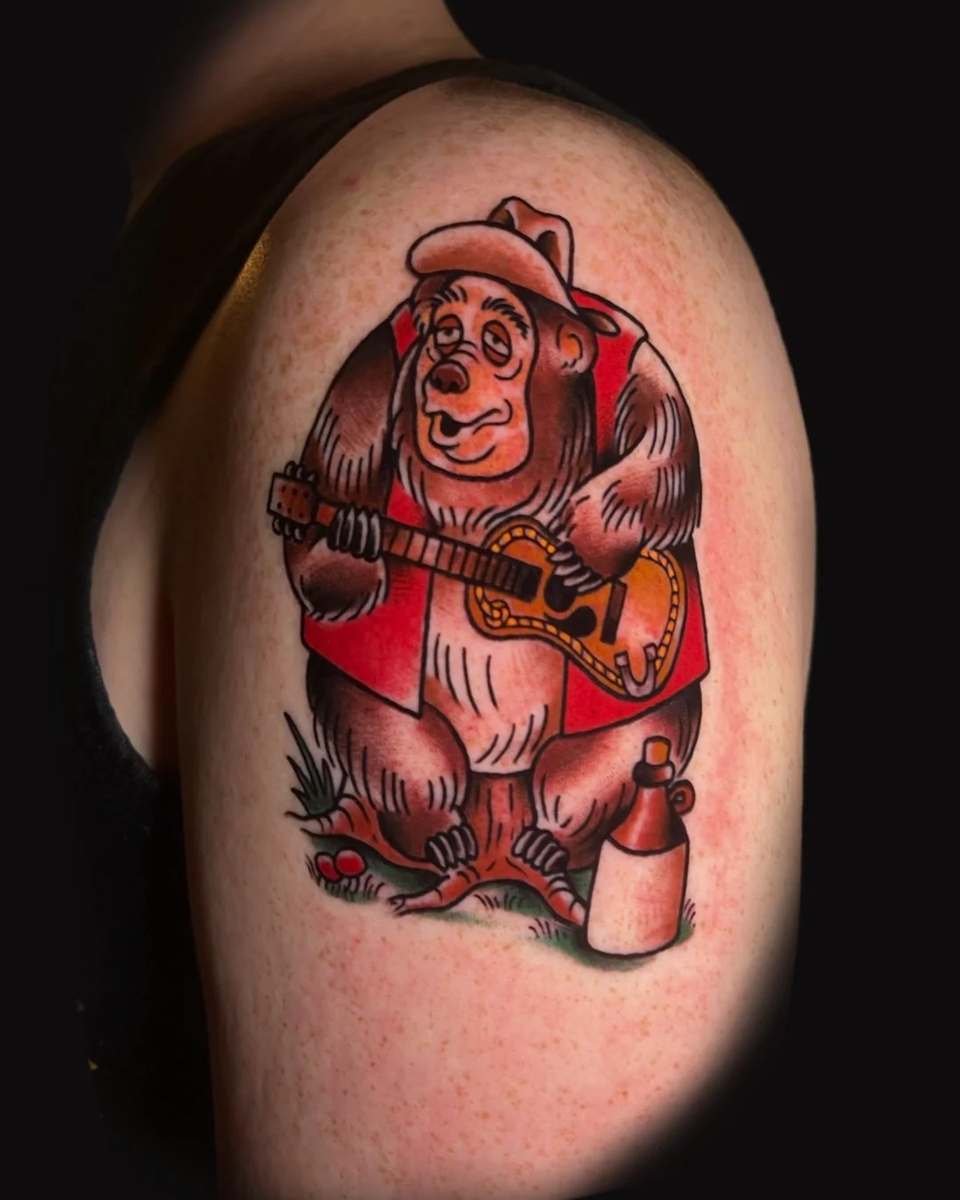 Tattoo of a bear playing guitar, wearing a hat and a red vest, sitting on grass with a bottle nearby View fullsize