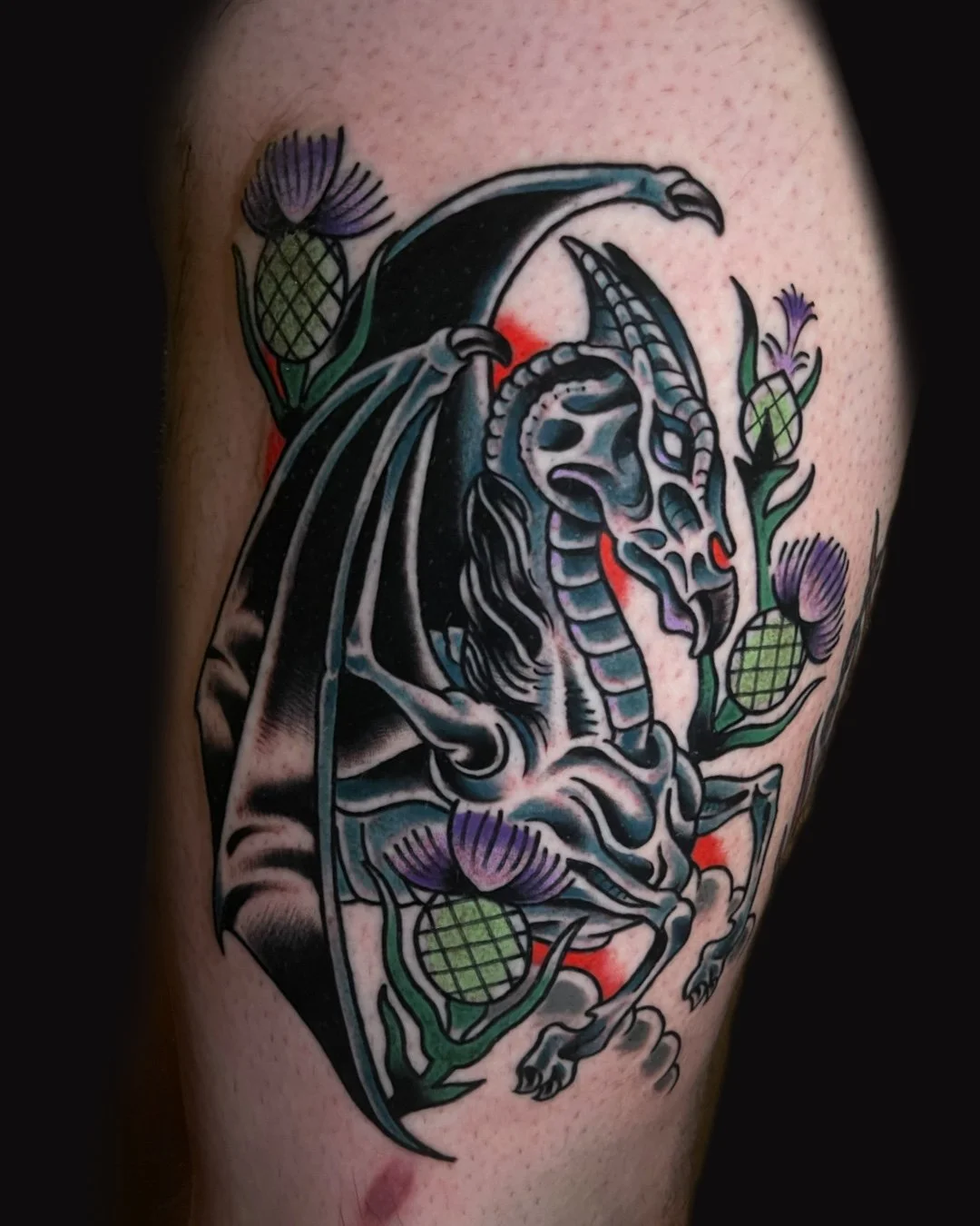 Tattoo of a mythical creature with a dragon's body, horse-like head with open mouth, surrounded by purple flowers with green stems and leaves, on skin with light freckles. View fullsize