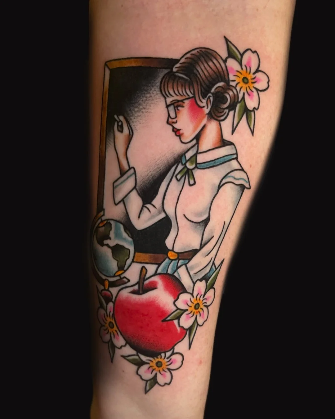 Tattoo of a vintage-style woman with glasses and a flower in her hair, looking into a mirror, surrounded by a globe, a red apple, and pink flowers.