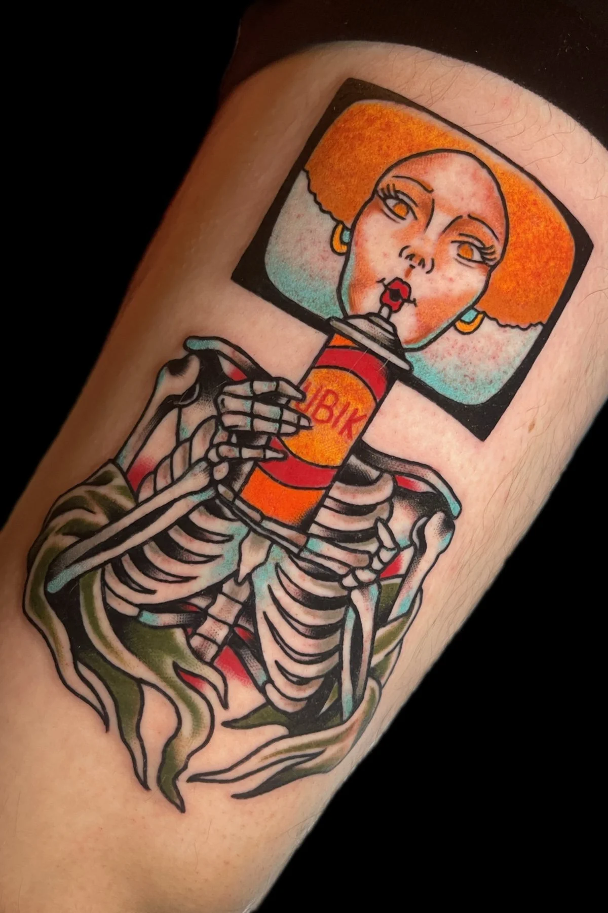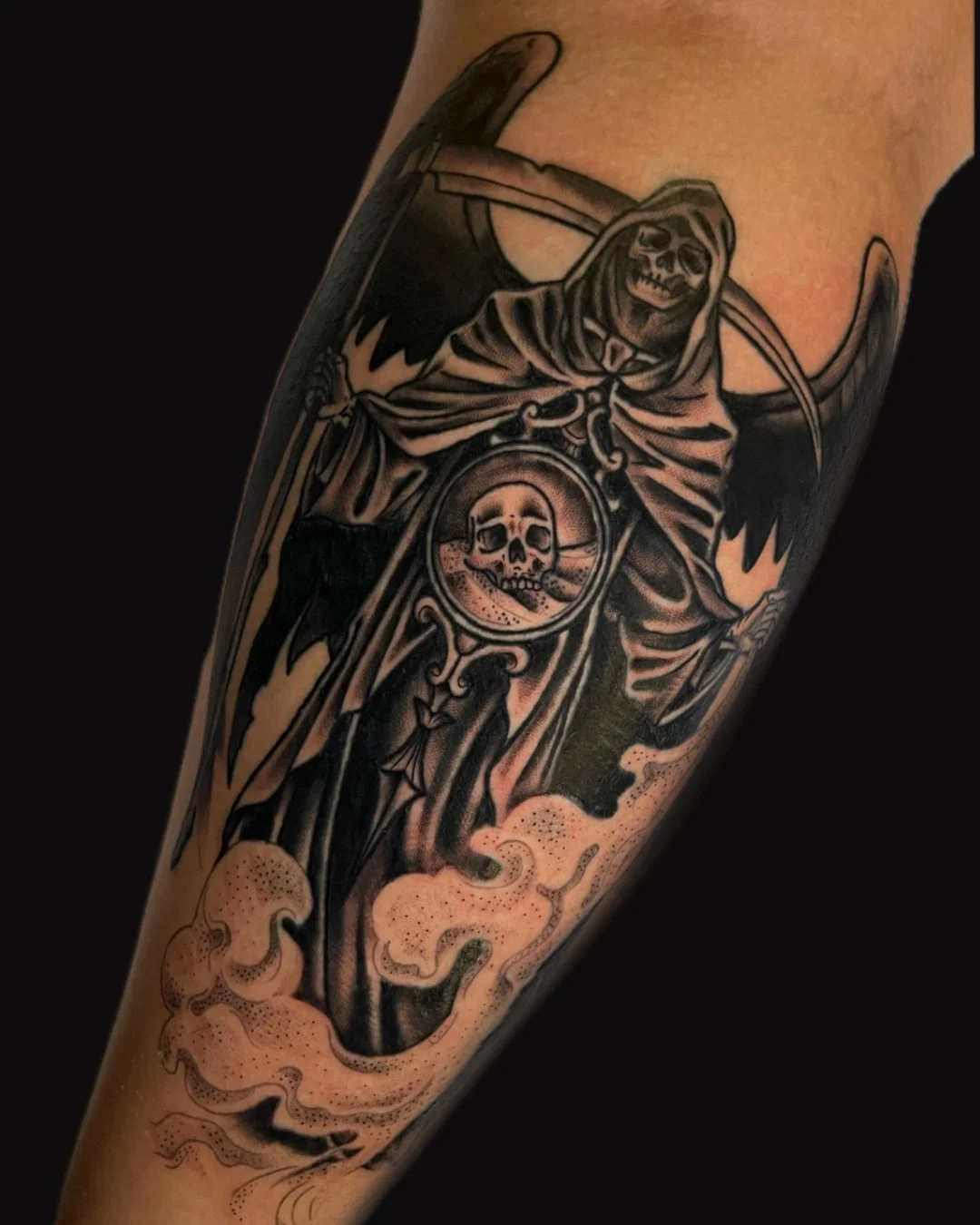 Tattoo of a grim reaper riding a motorcycle with a skull on the front, surrounded by smoke. View fullsize