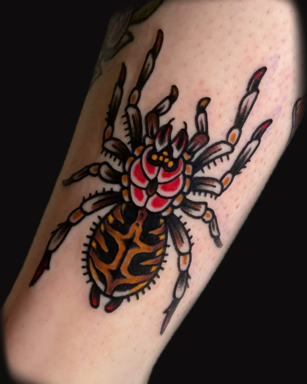 Colorful tattoo of a spider with a patterned body, detailed legs, and vibrant red, black, and orange markings on skin.