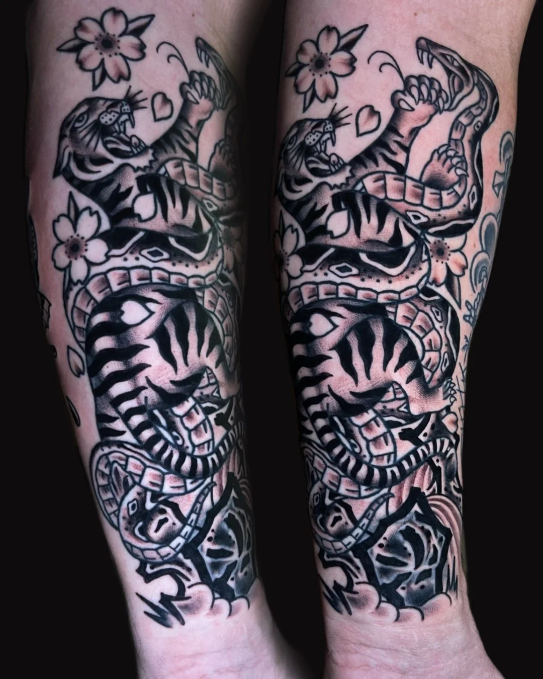 Tattoo of a fierce tiger with an open mouth, surrounded by cherry blossoms and a heart, in black and gray ink on person's forearm. View fullsize