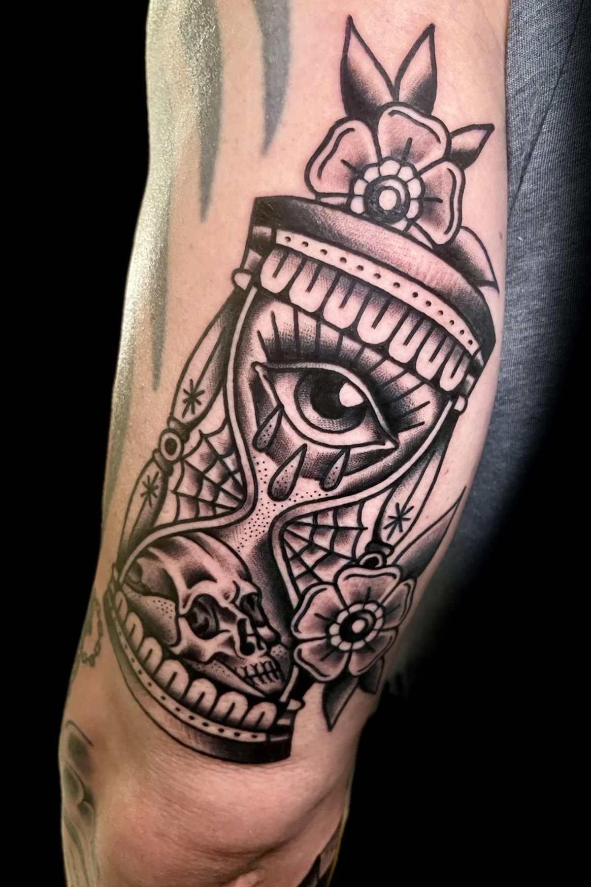 Black and gray tattoo featuring an eye with tears, a skull, flowers, spiderwebs, and decorative elements on a person's arm.