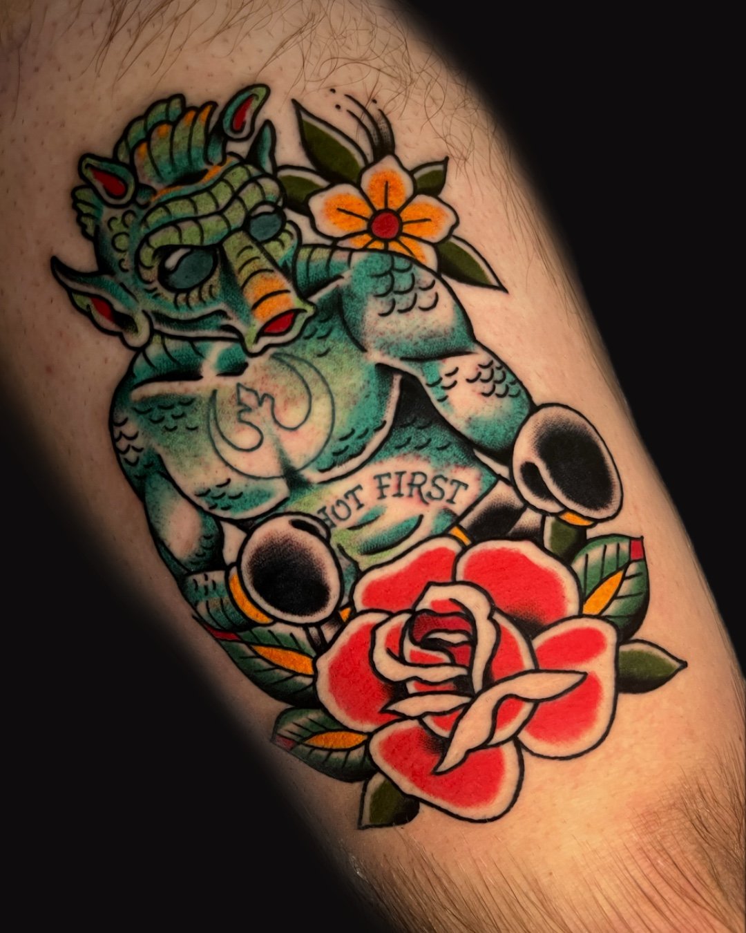 Tattoo of a mythical creature with a dragon's body, horse-like head with open mouth, surrounded by purple flowers with green stems and leaves, on skin with light freckles.